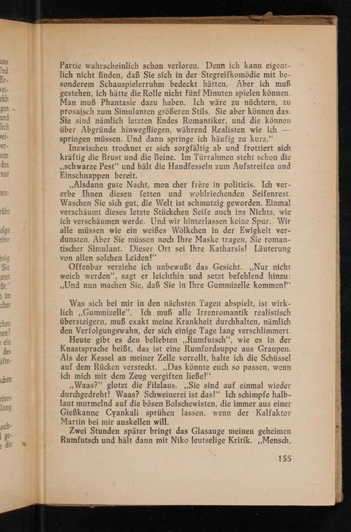 „Waas?‘ glotzt die Filzlaus. ‚Sie sind auf einmal wieder durchgedreht! Waas? Schweinerei ist das!‘ Ich schimpfe halb- laut murmelnd auf die bösen Bolschewisten, die immer aus einer Gießkanne Cyankali sprühen lassen, wenn der Kalfaktor Martin bei mir auskellen will,