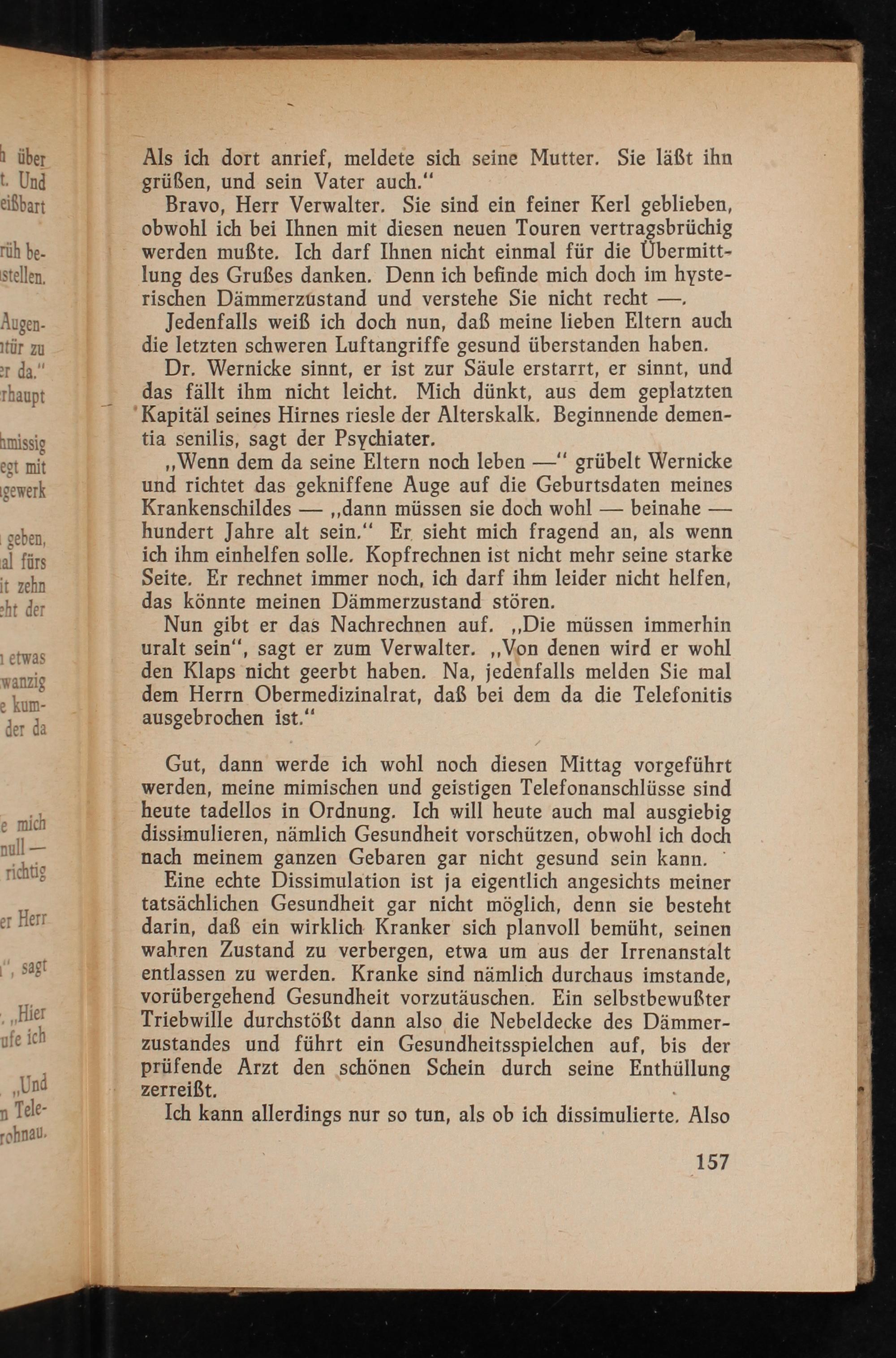 Eine echte Dissimulation ist ja eigentlich angesichts meiner tatsächlichen Gesundheit gar nicht möglich, denn sie besteht darin, daß ein wirklich Kranker sich planvoll bemüht, seinen wahren Zustand zu verbergen, etwa um aus der Irrenanstalt entlassen zu werden. Kranke sind nämlich durchaus imstande, vorübergehend Gesundheit vorzutäuschen. Ein selbstbewußter Triebwille durchstößt dann also die Nebeldecke des Dämmerzustandes und führt ein Gesundheitsspielchen auf, bis der prüfende Arzt den schönen Schein durch seine Enthüllung zerreißt.
