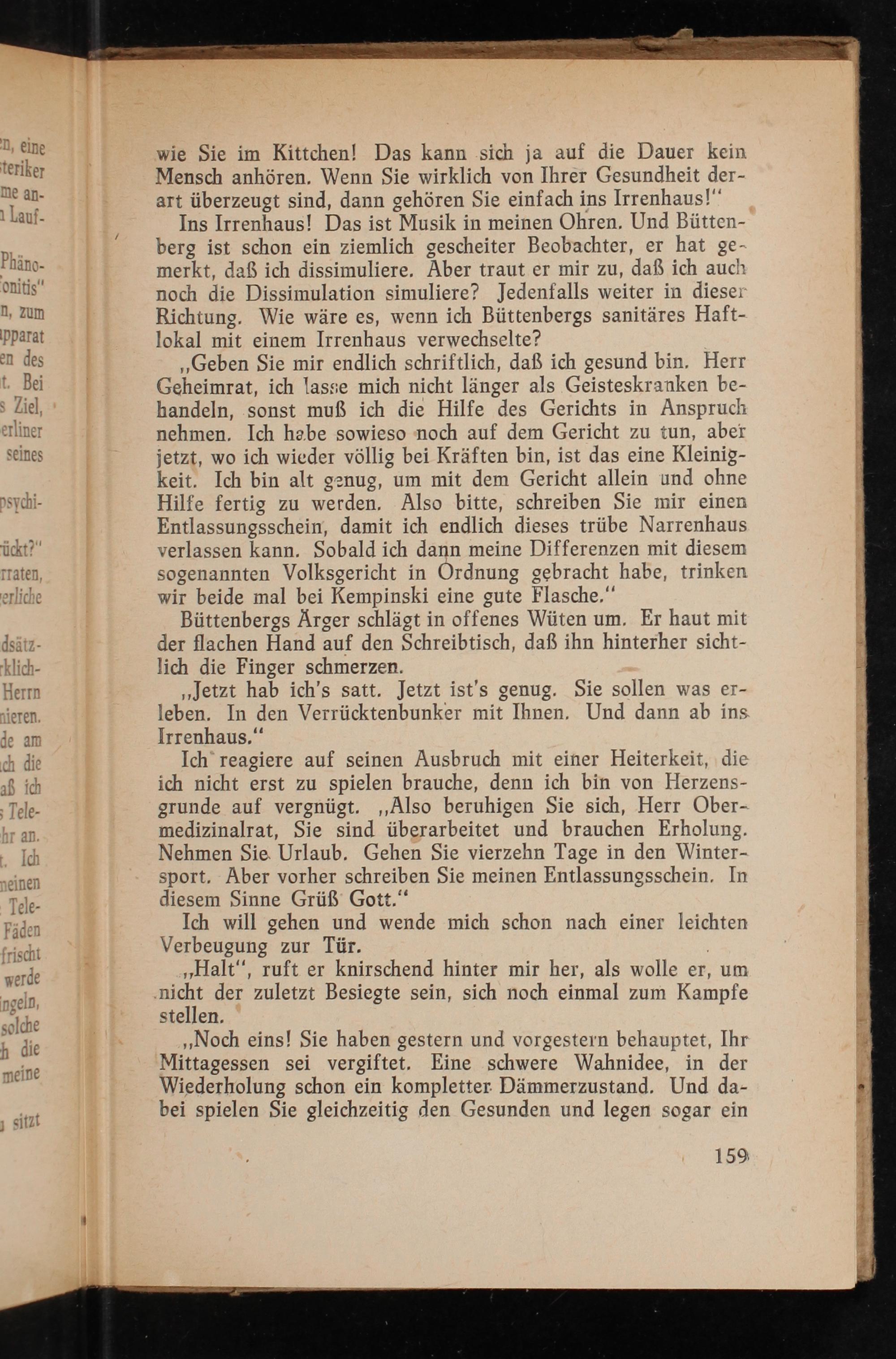 Geben Sie mir endlich schriftlich, daß ich gesund bin. Herr Geheimrat, ich lasse mich nicht länger als Geisteskranken behandeln, sonst muß ich die Hilfe des Gerichts in Anspruch nehmen. Ich habe sowieso noch auf dem Gericht zu tun, aber jetzt, wo ich wieder völlig bei Kräften bin, ist das eine Kleinigkeit. Ich bin alt genug, um mit dem Gericht allein und ohne Hilfe fertig zu werden. Also bitte, schreiben Sie mir einen Entlassungsschein, damit ich endlich dieses trübe Narrenhaus verlassen kann. Sobald ich dann meine Differenzen mit diesem sogenannten Volksgericht in Ordnung gebracht habe, trinken wir beide mal bei Kempinski eine gute Flasche."