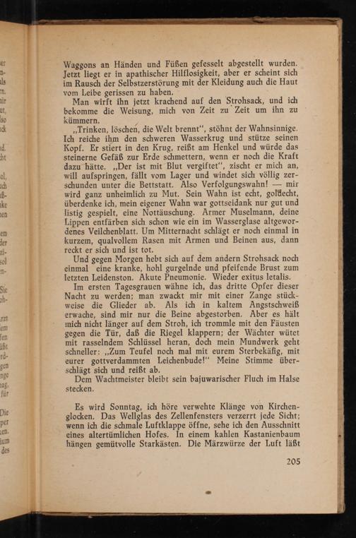 „Trinken, löschen, die Welt brennt‘, stöhnt der Wahnsinnige. "Ich reiche ihm den schweren Wasserkrug und stütze seinen Kopf. Er stiert in den Krug, reißt am Henkel und würde das steinerne Gefäß zur Erde schmettern, wenn er noch die Kraft dazu hätte.„Der ist mit Blut vergiftet‘, zischt er mich an, will aufspringen, fällt vom Lager und windet sich völlig zer- schunden unter die Bettstatt. Also Verfolgungswahn!— mir wird ganz unheimlich zu Mut. Sein Wahn ist echt, goldecht, überdenke ich, mein eigener Wahn war gottseidank nur gut und listig gespielt, eine Nottäuschung. Armer Muselmann, deine Lippen entfärben sich schon wie ein im Wasserglase altgewor- denes Veilchenblatt. Um Mitternacht schlägt er noch einmal in kurzem, qualvollem Rasen mit Armen und Beinen aus, dann reckt er sich und ist tot.