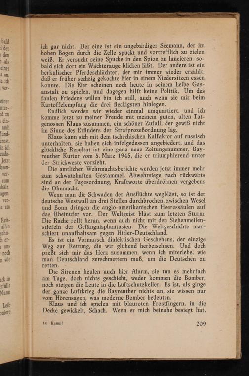Klaus kann sich mit dem tschechischen Kalfaktor auf russisch unterhalten, sie haben sich infolgedessen angebiedert, und das glückliche Resultat ist eine ganz neue Zeitungsnummer, Bayreuther Kurier vom 5. März 1945, die er triumphierend unter der Strickweste vorzieht.