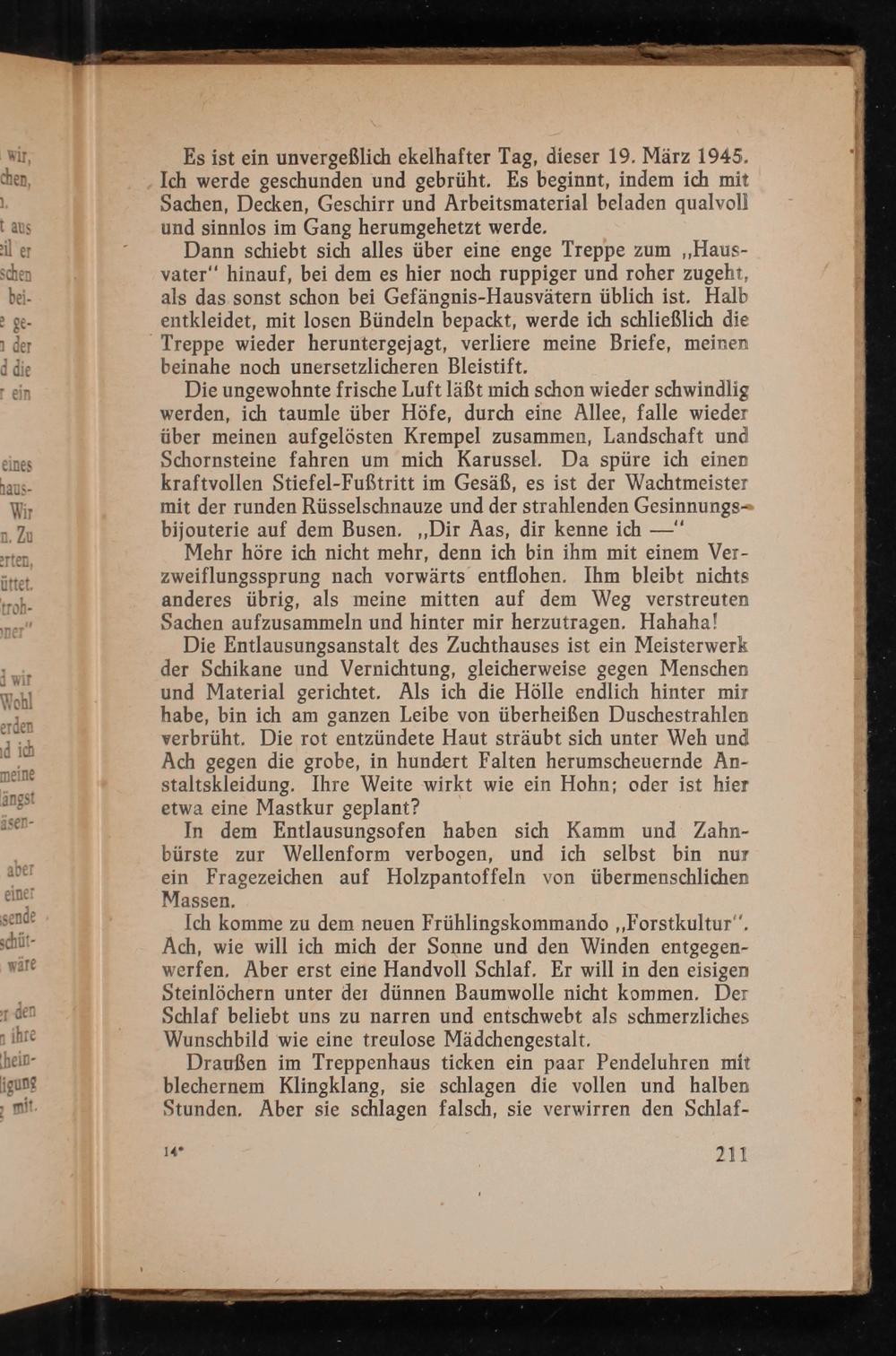 Es ist ein unvergeßlich ekelhafter Tag, dieser 19. März 1945. Ich werde geschunden und gebrüht. Es beginnt, indem ich mit Sachen, Decken, Geschirr und Arbeitsmaterial beladen qualvoll und sinnlos im Gang herumgehetzt werde.