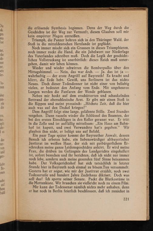 Ein paar Tage später kommt der Bayreuther Anwalt, dessen Besuch ich erbeten habe, ein liebenswürdiger altbayerischer Justizrat im weißen Haar, der sich mit gutbürgerlichem Er- schrecken meine ganze Leidensgeschichte anhört. Er wird meine Frau, die drüben im Gefängnis des Landgerichts eingekellert ist, sofort besuchen und ihr berichten, daß ich nicht nur immer noch lebe, sondern auch meine gesunden fünf Sinne beisammen habe. Der Volksgerichtshof hat sich tatsächlich in letzter Stunde hier in Bayreuth noch einmal zu bösem Tun versammelt. Gestern hat er sogar, wie mir der Justirrat erzählt, noch zwei Todesurteile und hundert Jahre Zuchthaus diktiert. Doch was soll das! Ich spotte seiner Senate. Packt die Blutkostüme in die Mottenkiste. Wir brauchen sie vielleicht noch zu einem Film.