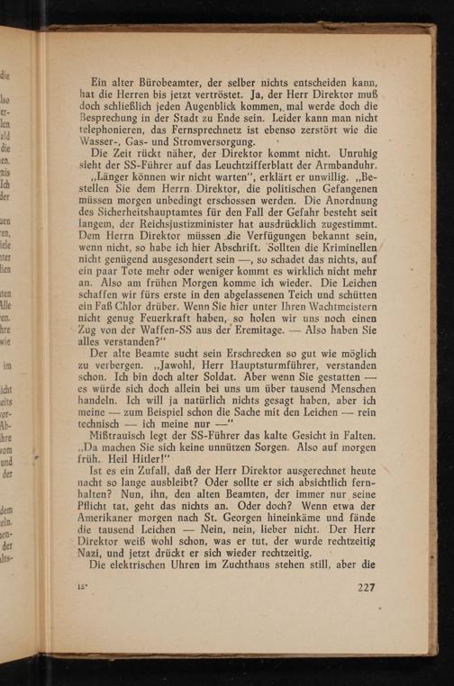 Ist es ein Zufall, daß der Herr Direktor ausgerechnet heute nacht so lange ausbleibt? Oder sollte er sich absichtlich fernhalten? Nun, ihn, den alten Beamten, der immer nur seine Pflicht tat, geht das nichts an. Oder doch? Wenn etwa der Amerikaner morgen nach St. Georgen hineinkäme und fände die tausend Leichen Nein, nein, lieber nicht. Der Herr Direktor weiß wohl schon, was er tut, der wurde rechtzeitig Nazi, und jetzt drückt er sich wieder rechtzeitig.