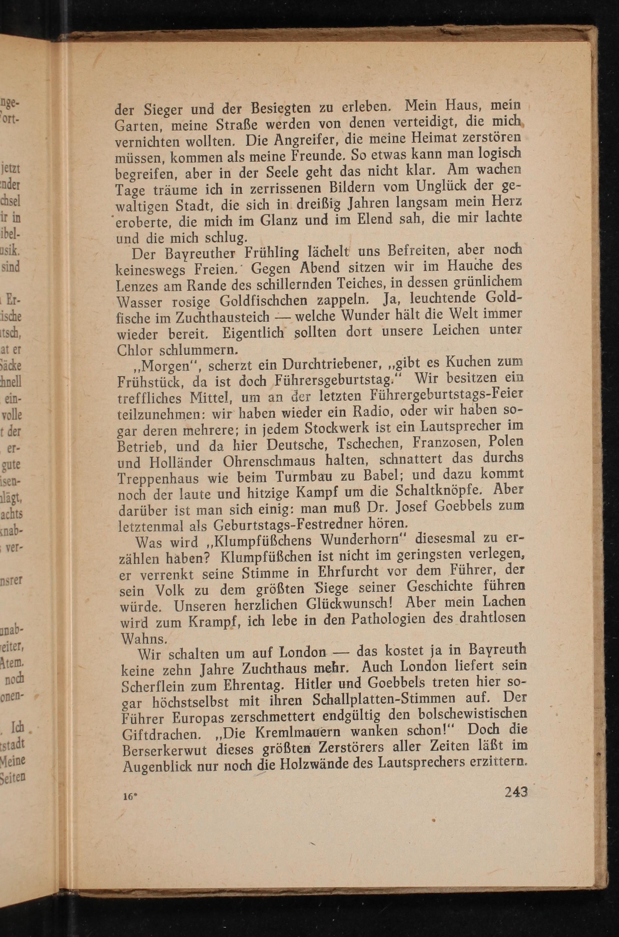 ,, Morgen", scherzt ein Durchtriebener ,,, gibt es Kuchen zum Frühstück, da ist doch Führersgeburtstag." Wir besitzen ein treffliches Mittel, um an der letzten Führergeburtstags- Feier teilzunehmen: wir haben wieder ein Radio, oder wir haben sogar deren mehrere; in jedem Stockwerk ist ein Lautsprecher im Betrieb, und da hier Deutsche, Tschechen, Franzosen, Polen und Holländer Ohrenschmaus halten, schnattert das durchs Treppenhaus wie beim Turmbau zu Babel ; und dazu kommt noch der laute und hitzige Kampf um die Schaltknöpfe. Aber darüber ist man sich einig: man muß Dr. Josef Goebbels zum letztenmal als Geburtstags- Festredner hören.