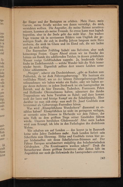 Was wird ,, Klumpfüßchens Wunderhorn" diesesmal zu erzählen haben? Klumpfüßchen ist nicht im geringsten verlegen, er verrenkt seine Stimme in Ehrfurcht vor dem Führer, der sein Volk zu dem größten Siege seiner Geschichte führen würde. Unseren herzlichen Glückwunsch! Aber mein Lachen wird zum Krampf, ich lebe in den Pathologien des drahtlosen Wahns.