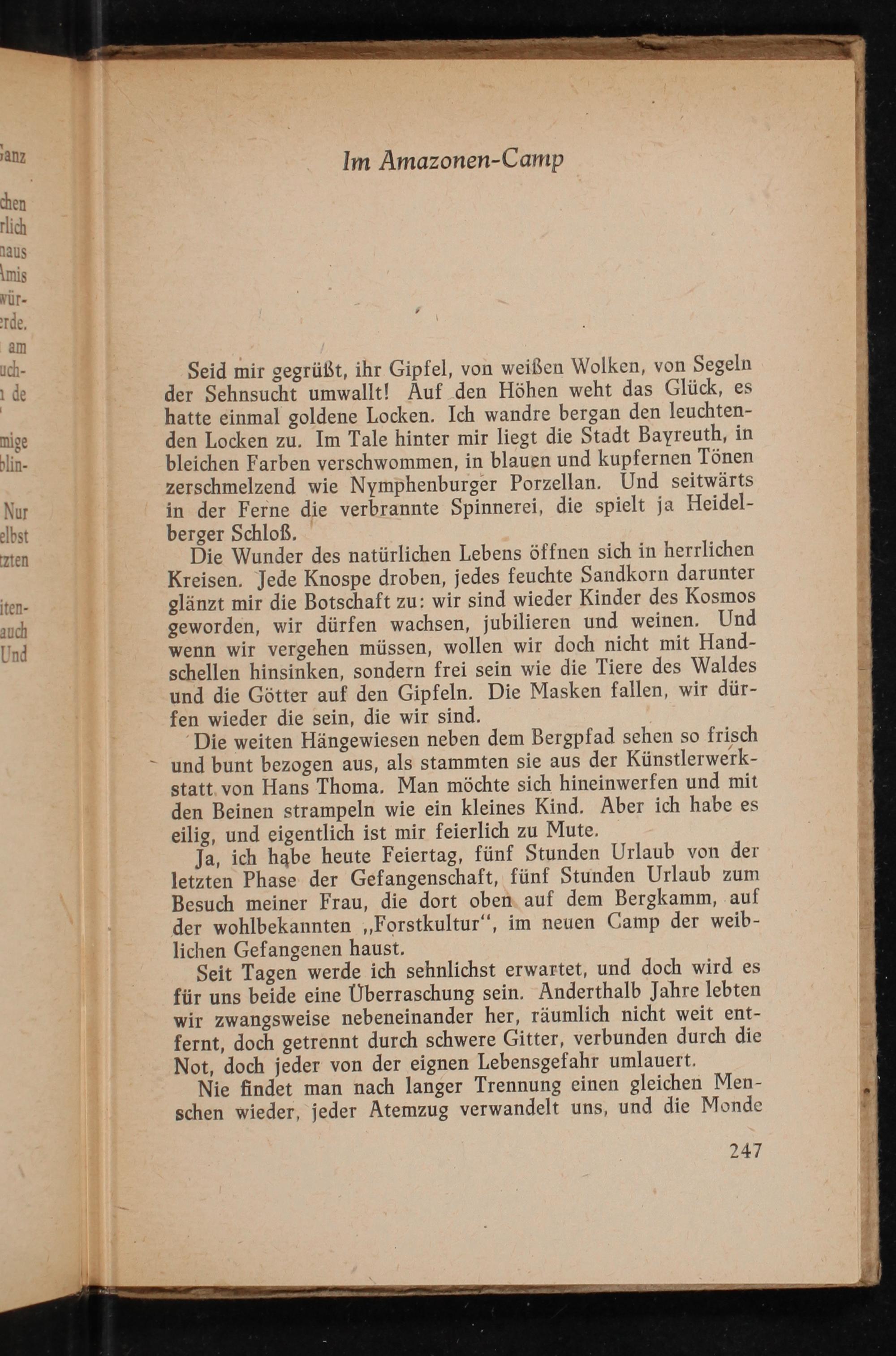 Ja, ich habe heute Feiertag, fünf Stunden Urlaub von der letzten Phase der Gefangenschaft, fünf Stunden Urlaub zum Besuch meiner Frau, die dort oben auf dem Bergkamm, auf der wohlbekannten ,, Forstkultur", im neuen Camp der weiblichen Gefangenen haust.
