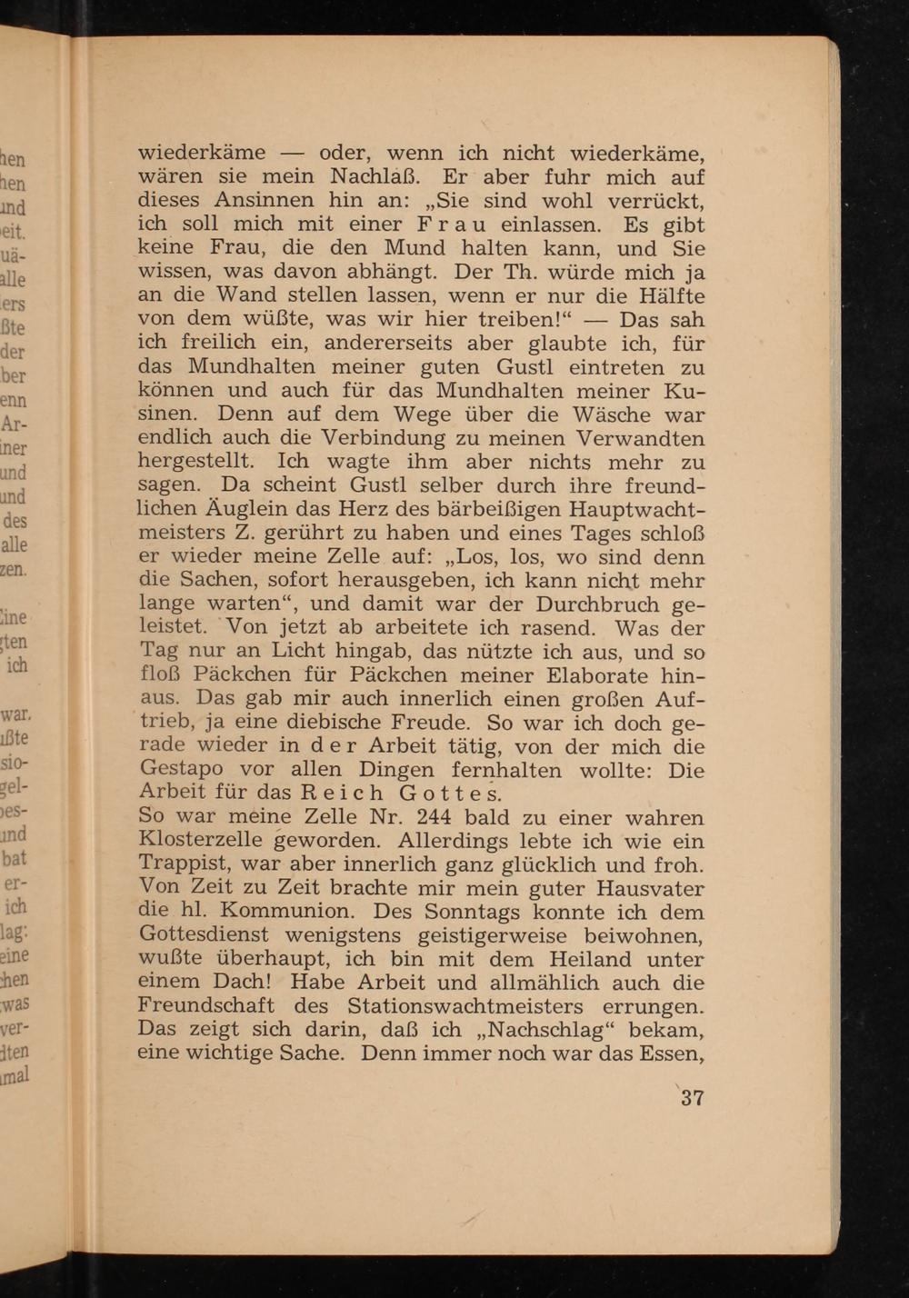 So war meine Zelle Nr. 244 bald zu einer wahren Klosterzelle geworden. Allerdings lebte ich wie ein Trappist, war aber innerlich ganz glücklich und froh. Von Zeit zu Zeit brachte mir mein guter Hausvater die hl. Kommunion. Des Sonntags konnte ich dem Gottesdienst wenigstens geistigerweise beiwohnen, wußte überhaupt, ich bin mit dem Heiland unter einem Dach! Habe Arbeit und allmählich auch die Freundschaft des Stationswachtmeisters errungen. Das zeigt sich darin, daß ich„ Nachschlag" bekam, eine wichtige Sache. Denn immer noch war das Essen,