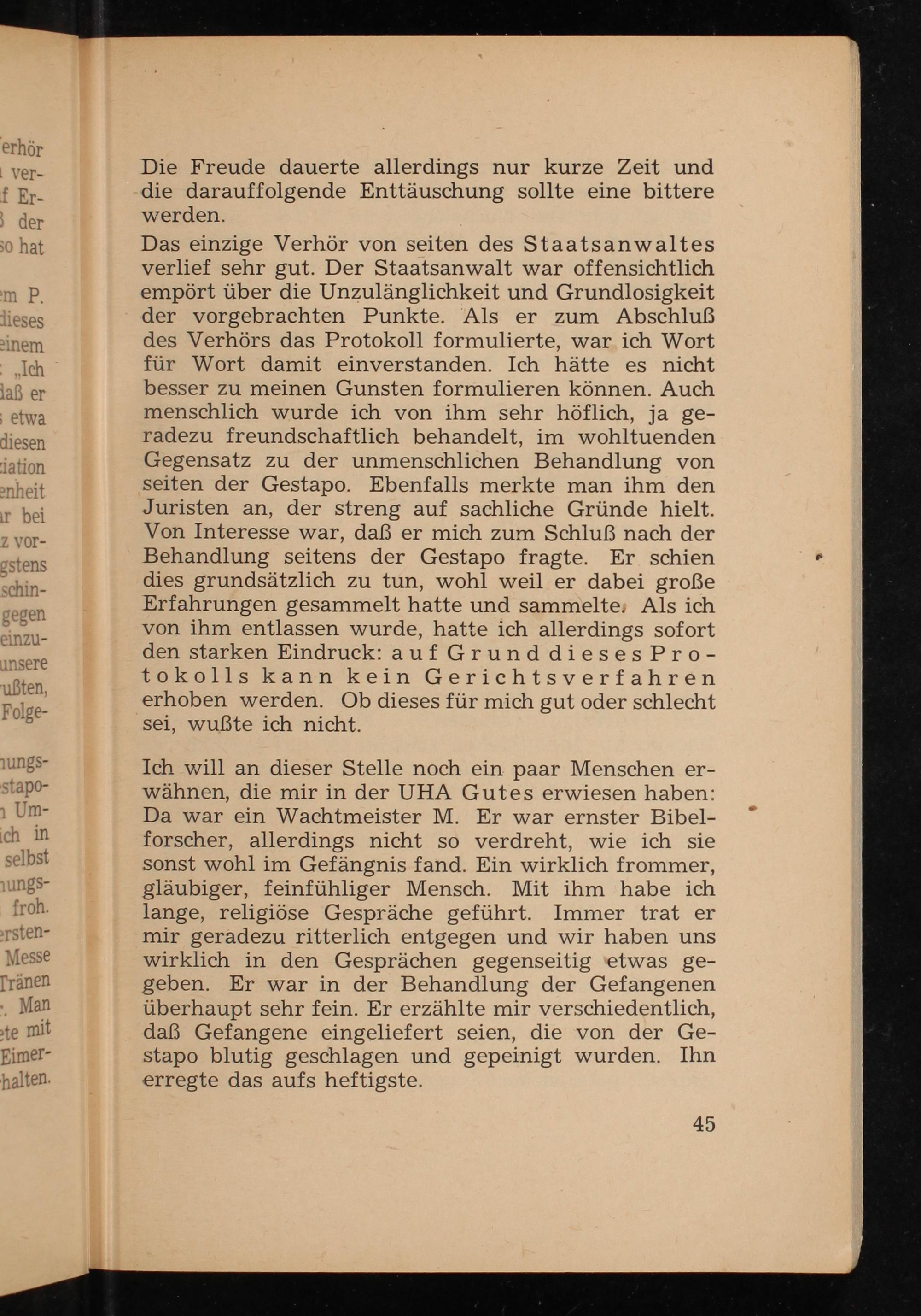 Ich will an dieser Stelle noch ein paar Menschen erwähnen, die mir in der UHA Gutes erwiesen haben: Da war ein Wachtmeister M. Er war ernster Bibelforscher, allerdings nicht so verdreht, wie ich sie sonst wohl im Gefängnis fand. Ein wirklich frommer, gläubiger, feinfühliger Mensch. Mit ihm habe ich lange, religiöse Gespräche geführt. Immer trat er mir geradezu ritterlich entgegen und wir haben uns wirklich in den Gesprächen gegenseitig etwas gegeben. Er war in der Behandlung der Gefangenen überhaupt sehr fein. Er erzählte mir verschiedentlich, daß Gefangene eingeliefert seien, die von der Gestapo blutig geschlagen und gepeinigt wurden. Ihn erregte das aufs heftigste.