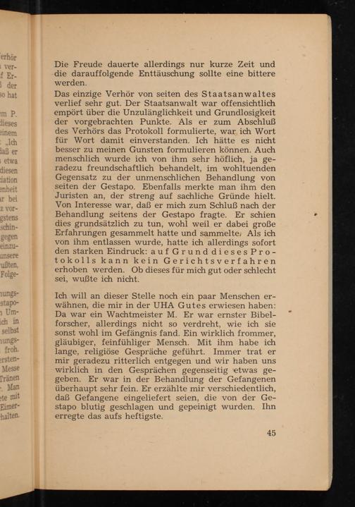 Das einzige Verhör von seiten des Staatsanwaltes verlief sehr gut. Der Staatsanwalt war offensichtlich empört über die Unzulänglichkeit und Grundlosigkeit der vorgebrachten Punkte. Als er zum Abschluß des Verhörs das Protokoll formulierte, war ich Wort für Wort damit einverstanden. Ich hätte es nicht besser zu meinen Gunsten formulieren können. Auch menschlich wurde ich von ihm sehr höflich, ja geradezu freundschaftlich behandelt, im wohltuenden Gegensatz zu der unmenschlichen Behandlung von seiten der Gestapo . Ebenfalls merkte man ihm den Juristen an, der streng auf sachliche Gründe hielt. Von Interesse war, daß er mich zum Schluß nach der Behandlung seitens der Gestapo fragte. Er schien dies grundsätzlich zu tun, wohl weil er dabei große Erfahrungen gesammelt hatte und sammelte. Als ich von ihm entlassen wurde, hatte ich allerdings sofort den starken Eindruck: auf Grund dieses Protokolls kann kein Gerichtsverfahren erhoben werden. Ob dieses für mich gut oder schlecht sei, wußte ich nicht.