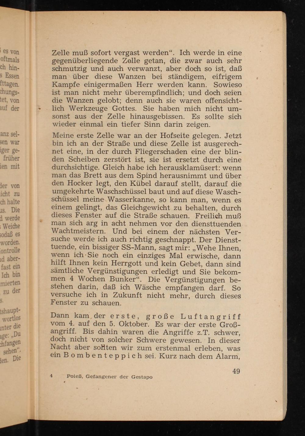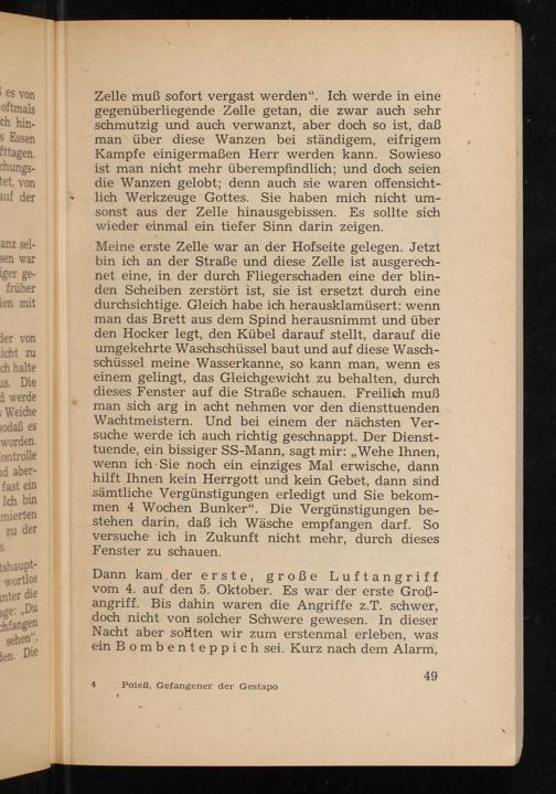 Zelle muẞ sofort vergast werden". Ich werde in eine gegenüberliegende Zelle getan, die zwar auch sehr schmutzig und auch verwanzt, aber doch so ist, daß man über diese Wanzen bei ständigem, eifrigem Kampfe einigermaßen Herr werden kann. Sowieso ist man nicht mehr überempfindlich; und doch seien die Wanzen gelobt; denn auch sie waren offensichtlich Werkzeuge Gottes. Sie haben mich nicht umsonst aus der Zelle hinausgebissen. Es sollte sich wieder einmal ein tiefer Sinn darin zeigen.