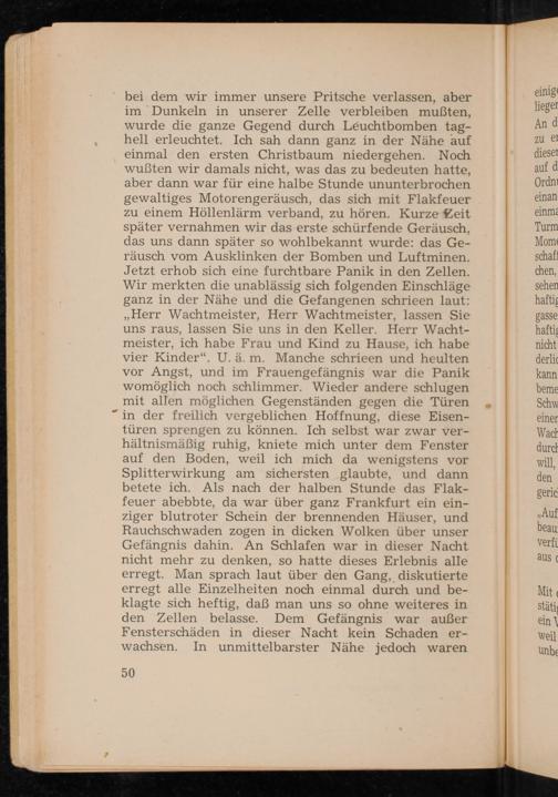 bei dem wir immer unsere Pritsche verlassen, aber im Dunkeln in unserer Zelle verbleiben mußten, wurde die ganze Gegend durch Leuchtbomben taghell erleuchtet. Ich sah dann ganz in der Nähe auf einmal den ersten Christbaum niedergehen. Noch wußten wir damals nicht, was das zu bedeuten hatte, aber dann war für eine halbe Stunde ununterbrochen gewaltiges Motorengeräusch, das sich mit Flakfeuer zu einem Höllenlärm verband, zu hören. Kurze Zeit später vernahmen wir das erste schürfende Geräusch, das uns dann später so wohlbekannt wurde: das Geräusch vom Ausklinken der Bomben und Luftminen. Jetzt erhob sich eine furchtbare Panik in den Zellen. Wir merkten die unablässig sich folgenden Einschläge ganz in der Nähe und die Gefangenen schrieen laut: ,, Herr Wachtmeister, Herr Wachtmeister, lassen Sie uns raus, lassen Sie uns in den Keller. Herr Wachtmeister, ich habe Frau und Kind zu Hause, ich habe vier Kinder". U. ä. m. Manche schrieen und heulten vor Angst, und im Frauengefängnis war die Panik womöglich noch schlimmer. Wieder andere schlugen mit allen möglichen Gegenständen gegen die Türen in der freilich vergeblichen Hoffnung, diese Eisentüren sprengen zu können. Ich selbst war zwar verhältnismäßig ruhig, kniete mich unter dem Fenster auf den Boden, weil ich mich da wenigstens vor Splitterwirkung am sichersten glaubte, und dann betete ich. Als nach der halben Stunde das Flakfeuer abebbte, da war über ganz Frankfurt ein einziger blutroter Schein der brennenden Häuser, und Rauchschwaden zogen in dicken Wolken über unser Gefängnis dahin. An Schlafen war in dieser Nacht nicht mehr zu denken, so hatte dieses Erlebnis alle erregt. Man sprach laut über den Gang, diskutierte erregt alle Einzelheiten noch einmal durch und beklagte sich heftig, daß man uns so ohne weiteres in den Zellen belasse. Dem Gefängnis war außer Fensterschäden in dieser Nacht kein Schaden erwachsen. In unmittelbarster Nähe jedoch waren
