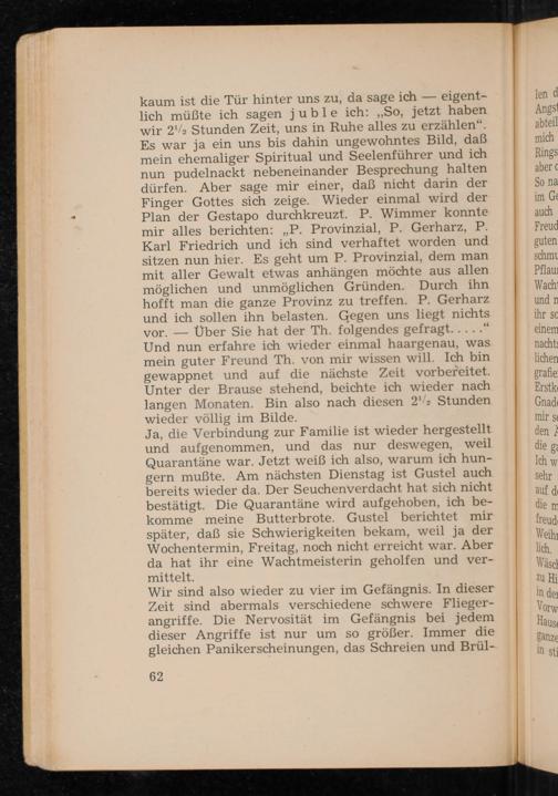 kaum ist die Tür hinter uns zu, da sage ich eigentlich müßte ich sagen juble ich: ,, So, jetzt haben wir 2 Stunden Zeit, uns in Ruhe alles zu erzählen". Es war ja ein uns bis dahin ungewohntes Bild, daß mein ehemaliger Spiritual und Seelenführer und ich nun pudelnackt nebeneinander Besprechung halten dürfen. Aber sage mir einer, daß nicht darin der Finger Gottes sich zeige. Wieder einmal wird der Plan der Gestapo durchkreuzt. P. Wimmer konnte mir alles berichten:„ P. Provinzial, P. Gerharz, P. Karl Friedrich und ich sind verhaftet worden und sitzen nun hier. Es geht um P. Provinzial, dem man mit aller Gewalt etwas anhängen möchte aus allen möglichen und unmöglichen Gründen. Durch ihn hofft man die ganze Provinz zu treffen. P. Gerharz und ich sollen ihn belasten. Gegen uns liegt nichts vor. Über Sie hat der Th. folgendes gefragt....." Und nun erfahre ich wieder einmal haargenau, was mein guter Freund Th. von mir wissen will. Ich bin gewappnet und auf die nächste Zeit vorbereitet. Unter der Brause stehend, beichte ich wieder nach langen Monaten. Bin also nach diesen 24 Stunden wieder völlig im Bilde.
