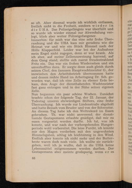 Nun begannen ein paar schöne Wochen. Zunächst brachte schon der folgende Tag, der 22. Januar, der Todestag unseres ehrwürdigen Stifters, eine frohe Überraschung. Ich wurde zur Lindenstraße abgeholt und hatte Besuch vom Bruder und von der Schwester. An diesem Tag habe ich den Weltrekord im Essen gebrochen. Th. war nicht anwesend; der diensttuende Gestapomann erlaubte gnädigst, daß mir zu essen vorgesetzt werden durfte. Ich tat, was ich konnte, und war nach der vorhergehenden Hungerperiode wohl vorbereitet. Die leise Furcht, ich könnte mir den Magen verderben mit den ungewohnten Himmelsgaben, schlug ich leichtsinnig in den Wind. Endlich aber konnte ich nicht mehr und der Butterbrote waren doch noch viele. Ich wollte sie zurückgeben, weil ich ja wußte, daß in die UHA keine Lebensmittel mitgenommen werden durften. Der Gestapomann aber meinte großspurig, wenn er es