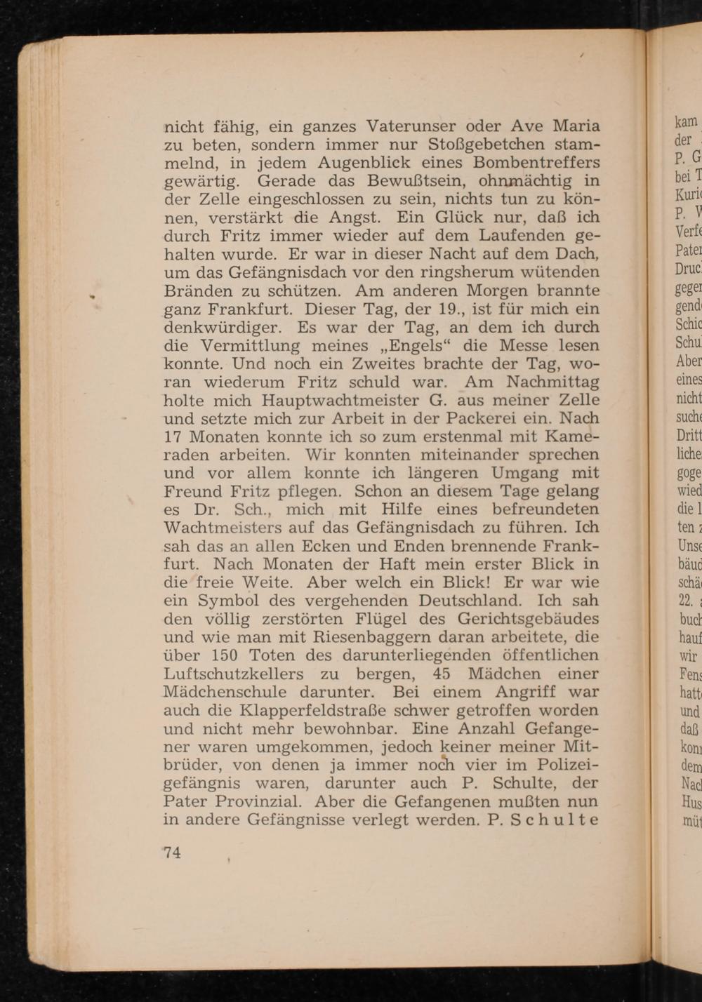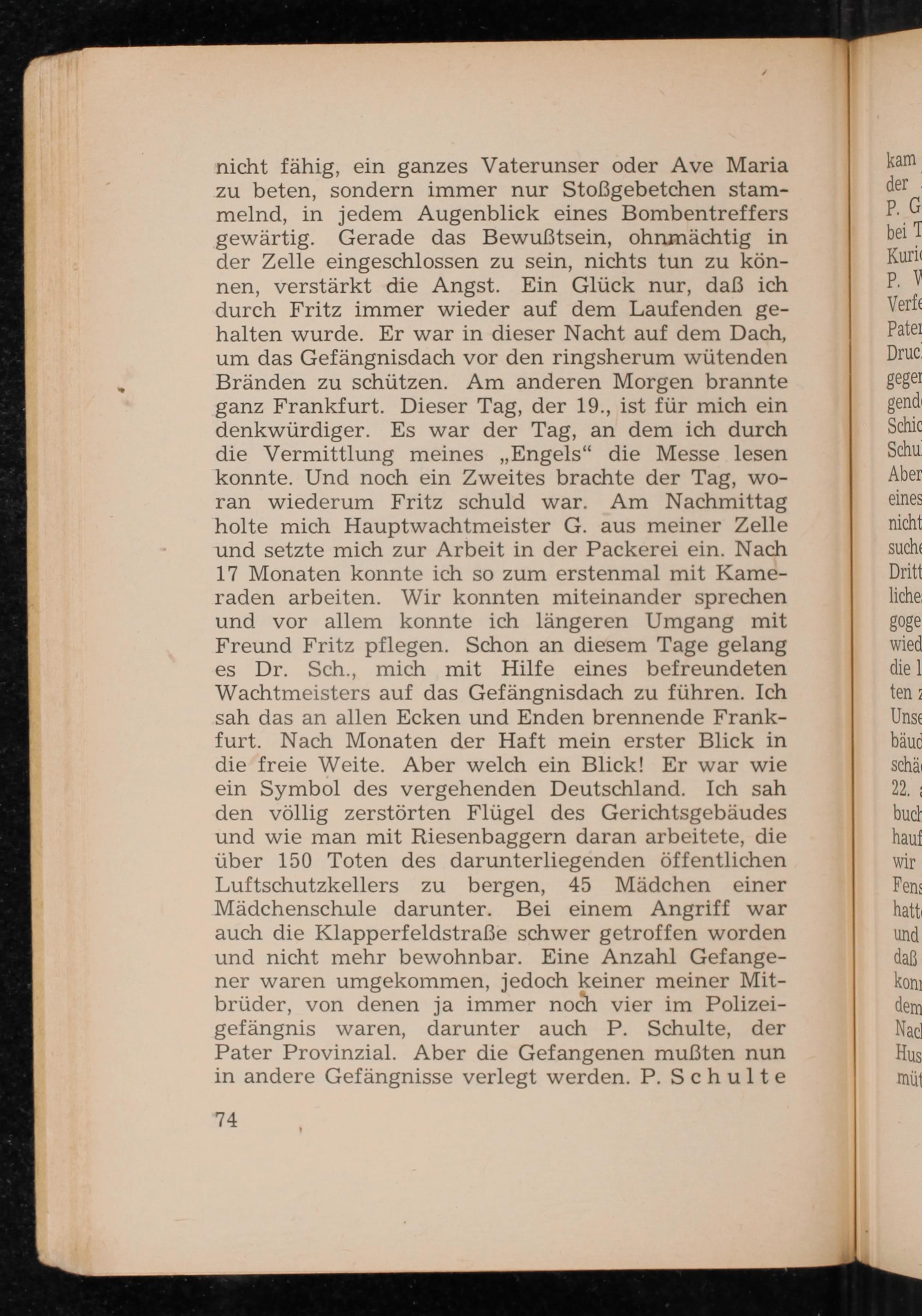 nicht fähig, ein ganzes Vaterunser oder Ave Maria zu beten, sondern immer nur Stoßgebetchen stam- melnd, in jedem Augenblick eines Bombentreffers gewärtig. Gerade das Bewußtsein, ohnmächtig in der Zelle eingeschlossen zu sein, nichts tun zu kön- nen, verstärkt die Angst. Ein Glück nur, daß ich durch Fritz immer wieder auf dem Laufenden ge- halten wurde. Er war in dieser Nacht auf dem Dach, um das Gefängnisdach vor den ringsherum wütenden Bränden zu schützen. Am anderen Morgen brannte ganz Frankfurt . Dieser Tag, der 19., ist für mich ein denkwürdiger. Es war der Tag, an dem ich durch die Vermittlung meines„Engels“ die Messe lesen konnte. Und noch ein Zweites brachte der Tag, wo- ran wiederum Fritz schuld war. Am Nachmittag holte mich Hauptwachtmeister G. aus meiner Zelle und setzte mich zur Arbeit in der Packerei ein. Nach 17 Monaten konnte ich so zum erstenmal mit Kame- raden arbeiten. Wir konnten miteinander sprechen und vor allem konnte ich längeren Umgang mit Freund Fritz pflegen. Schon an diesem Tage gelang es Dr. Sch., mich ‚mit Hilfe eines befreundeten Wachtmeisters auf das Gefängnisdach zu führen. Ich sah das an allen Ecken und Enden brennende Frank- furt. Nach Monaten der Haft mein erster Blick in die’freie Weite. Aber welch ein Blick! Er war wie ein Symbol des vergehenden Deutschland . Ich sah den völlig zerstörten Flügel des Gerichtsgebäudes und wie man mit Riesenbaggern daran arbeitete, die über 150 Toten des darunterliegenden öffentlichen Luftschutzkellers zu bergen, 45 Mädchen einer Mädchenschule darunter. Bei einem Angriff war auch die Klapperfeldstraße schwer getroffen worden und nicht mehr bewohnbar. Eine Anzahl Gefange- ner waren umgekommen, jedoch keiner meiner Mit- brüder, von denen ja immer noch vier im Polizei- gefängnis waren, darunter auch P. Schulte, der Pater Provinzial. Aber die Gefangenen mußten nun in andere Gefängnisse verlegt werden. P. Schulte
