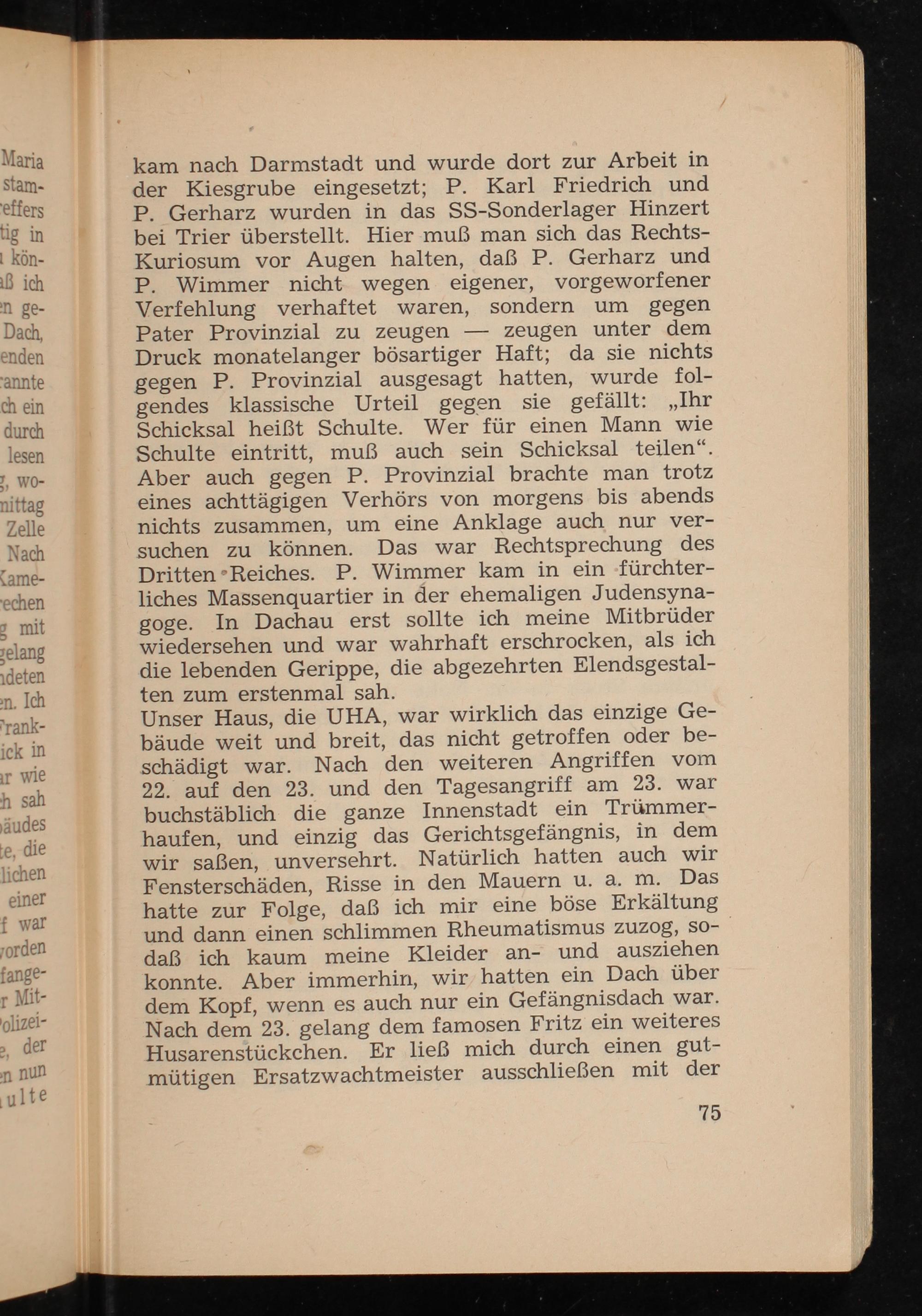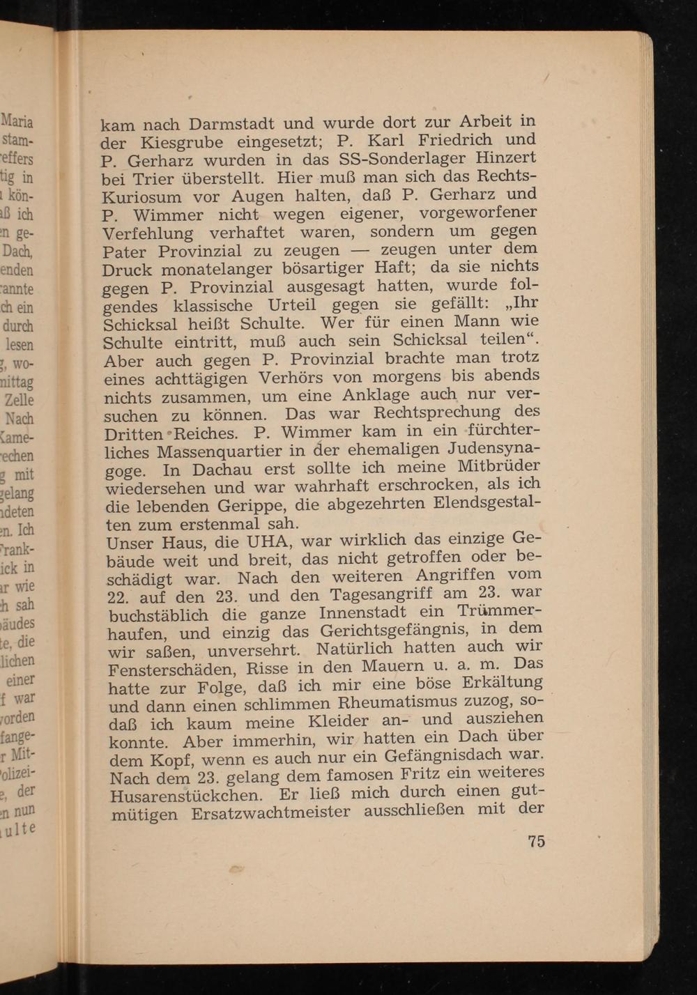 kam nach Darmstadt und wurde dort zur Arbeit in der Kiesgrube eingesetzt; P. Karl Friedrich und P. Gerharz wurden in das SS- Sonderlager Hinzert bei Trier überstellt. Hier muß man sich das RechtsKuriosum vor Augen halten, daß P. Gerharz und P. Wimmer nicht wegen eigener, vorgeworfener Verfehlung verhaftet waren, sondern um gegen Pater Provinzial zu zeugen unter dem zeugen Druck monatelanger bösartiger Haft; da sie nichts gegen P. Provinzial ausgesagt hatten, wurde folgendes klassische Urteil gegen sie gefällt:„ Ihr Schicksal heißt Schulte. Wer für einen Mann wie Schulte eintritt, muß auch sein Schicksal teilen". Aber auch gegen P. Provinzial brachte man trotz eines achttägigen Verhörs von morgens bis abends nichts zusammen, um eine Anklage auch nur versuchen zu können. Das war Rechtsprechung des Dritten Reiches . P. Wimmer kam in ein fürchterliches Massenquartier in der ehemaligen Judensynagoge. In Dachau erst sollte ich meine Mitbrüder wiedersehen und war wahrhaft erschrocken, als ich die lebenden Gerippe, die abgezehrten Elendsgestalten zum erstenmal sah.