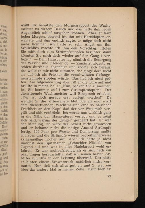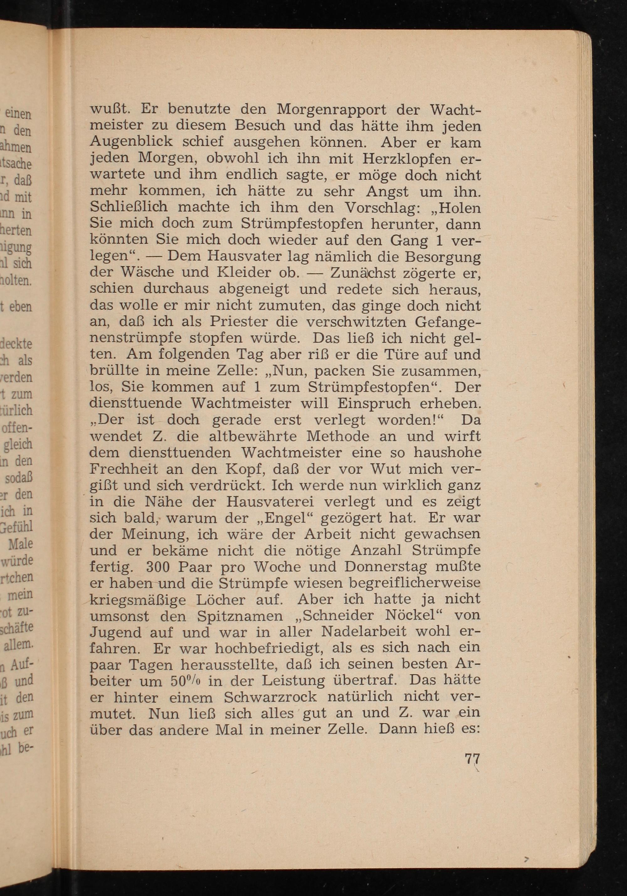 sich bald, warum der„Engel“ gezögert hat. Er war der Meinung, ich wäre der Arbeit nicht gewachsen und er bekäme nicht die nötige Anzahl Strümpfe fertig. 300 Paar pro Woche und Donnerstag mußte er haben und die Strümpfe wiesen begreiflicherweise kriegsmäßige Löcher auf. Aber ich hatte ja nicht umsonst den Spitznamen„Schneider Nöckel“ von Jugend auf und war in aller Nadelarbeit wohl er- fahren. Er war hochbefriedigt, als es sich nach ein paar Tagen herausstellte, daß ich seinen besten Ar- beiter um 50° in der Leistung übertraf. Das hätte er hinter einem Schwarzrock natürlich nicht ver- mutet. Nun ließ sich alles gut an und Z. war ein über das andere Mal in meiner Zelle. Dann hieß es: