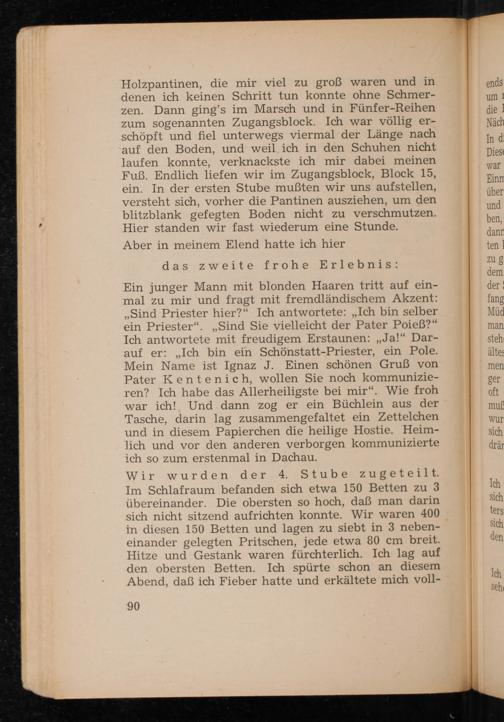 Ein junger Mann mit blonden Haaren tritt auf einmal zu mir und fragt mit fremdländischem Akzent: ,, Sind Priester hier?" Ich antwortete: ,, Ich bin selber ein Priester". ,, Sind Sie vielleicht der Pater Poieẞ?" Ich antwortete mit freudigem Erstaunen: ,, Ja!" Darauf er:„ Ich bin ein Schönstatt- Priester, ein Pole. Mein Name ist Ignaz J. Einen schönen Gruß von Pater Kentenich, wollen Sie noch kommunizieren? Ich habe das Allerheiligste bei mir". Wie froh war ich! Und dann zog er ein Büchlein aus der Tasche, darin lag zusammengefaltet ein Zettelchen und in diesem Papierchen die heilige Hostie. Heimlich und vor den anderen verborgen kommunizierte ich so zum erstenmal in Dachau .