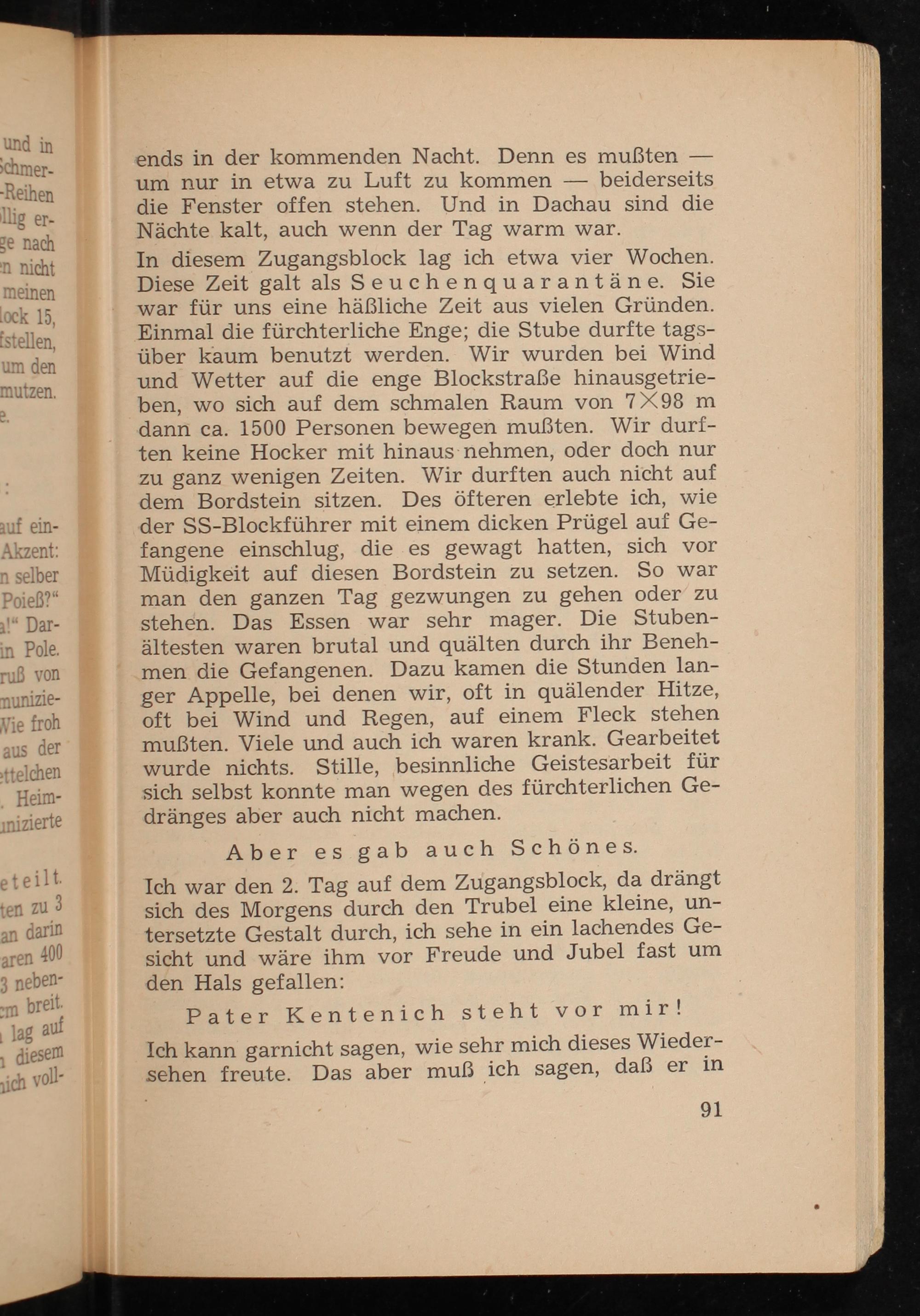 ends in der kommenden Nacht. Denn es mußten- - beiderseits um nur in etwa zu Luft zu kommen die Fenster offen stehen. Und in Dachau sind die Nächte kalt, auch wenn der Tag warm war. In diesem Zugangsblock lag ich etwa vier Wochen. Diese Zeit galt als Seuchenquarantäne. Sie war für uns eine häßliche Zeit aus vielen Gründen. Einmal die fürchterliche Enge; die Stube durfte tagsüber kaum benutzt werden. Wir wurden bei Wind und Wetter auf die enge Blockstraße hinausgetrieben, wo sich auf dem schmalen Raum von 7X98 m dann ca. 1500 Personen bewegen mußten. Wir durften keine Hocker mit hinaus nehmen, oder doch nur zu ganz wenigen Zeiten. Wir durften auch nicht auf dem Bordstein sitzen. Des öfteren erlebte ich, wie der SS- Blockführer mit einem dicken Prügel auf Gefangene einschlug, die es gewagt hatten, sich vor Müdigkeit auf diesen Bordstein zu setzen. So war man den ganzen Tag gezwungen zu gehen oder zu stehen. Das Essen war sehr mager. Die Stubenältesten waren brutal und quälten durch ihr Benehmen die Gefangenen. Dazu kamen die Stunden langer Appelle, bei denen wir, oft in quälender Hitze, oft bei Wind und Regen, auf einem Fleck stehen mußten. Viele und auch ich waren krank. Gearbeitet wurde nichts. Stille, besinnliche Geistesarbeit für sich selbst konnte man wegen des fürchterlichen Gedränges aber auch nicht machen.