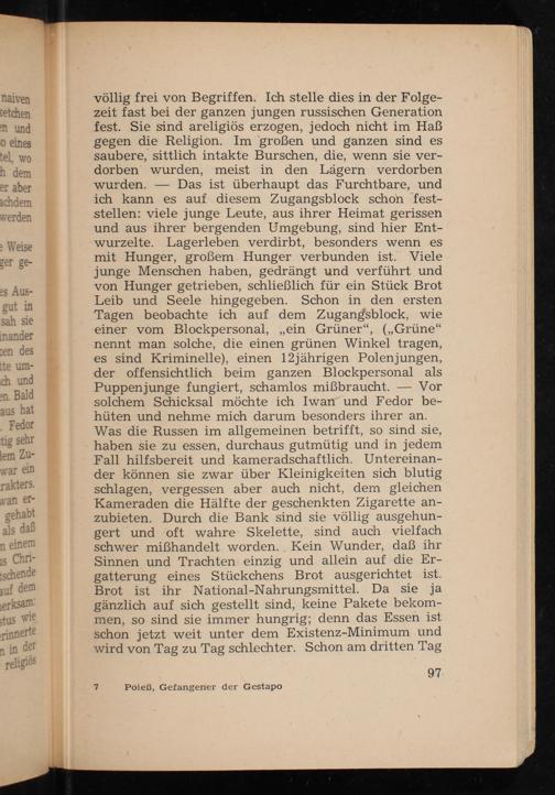 völlig frei von Begriffen. Ich stelle dies in der Folgezeit fast bei der ganzen jungen russischen Generation fest. Sie sind areligiös erzogen, jedoch nicht im Haẞ gegen die Religion. Im großen und ganzen sind es saubere, sittlich intakte Burschen, die, wenn sie verdorben wurden, meist in den Lägern verdorben wurden. Das ist überhaupt das Furchtbare, und ich kann es auf diesem Zugangsblock schon feststellen: viele junge Leute, aus ihrer Heimat gerissen und aus ihrer bergenden Umgebung, sind hier Entwurzelte. Lagerleben verdirbt, besonders wenn es mit Hunger, großem Hunger verbunden ist. Viele junge Menschen haben, gedrängt und verführt und von Hunger getrieben, schließlich für ein Stück Brot Leib und Seele hingegeben. Schon in den ersten Tagen beobachte ich auf dem Zugangsblock, wie einer vom Blockpersonal ,,, ein Grüner",(„ Grüne" nennt man solche, die einen grünen Winkel tragen, es sind Kriminelle), einen 12jährigen Polenjungen, der offensichtlich beim ganzen Blockpersonal als Puppenjunge fungiert, schamlos mißbraucht. Vor solchem Schicksal möchte ich Iwan und Fedor behüten und nehme mich darum besonders ihrer an. Was die Russen im allgemeinen betrifft, so sind sie, haben sie zu essen, durchaus gutmütig und in jedem Fall hilfsbereit und kameradschaftlich. Untereinander können sie zwar über Kleinigkeiten sich blutig schlagen, vergessen aber auch nicht, dem gleichen Kameraden die Hälfte der geschenkten Zigarette anzubieten. Durch die Bank sind sie völlig ausgehungert und oft wahre Skelette, sind auch vielfach schwer mißhandelt worden. Kein Wunder, daß ihr Sinnen und Trachten einzig und allein auf die Ergatterung eines Stückchens Brot ausgerichtet ist. Brot ist ihr National- Nahrungsmittel. Da sie ja gänzlich auf sich gestellt sind, keine Pakete bekommen, so sind sie immer hungrig; denn das Essen ist schon jetzt weit unter dem Existenz- Minimum und wird von Tag zu Tag schlechter. Schon am dritten Tag