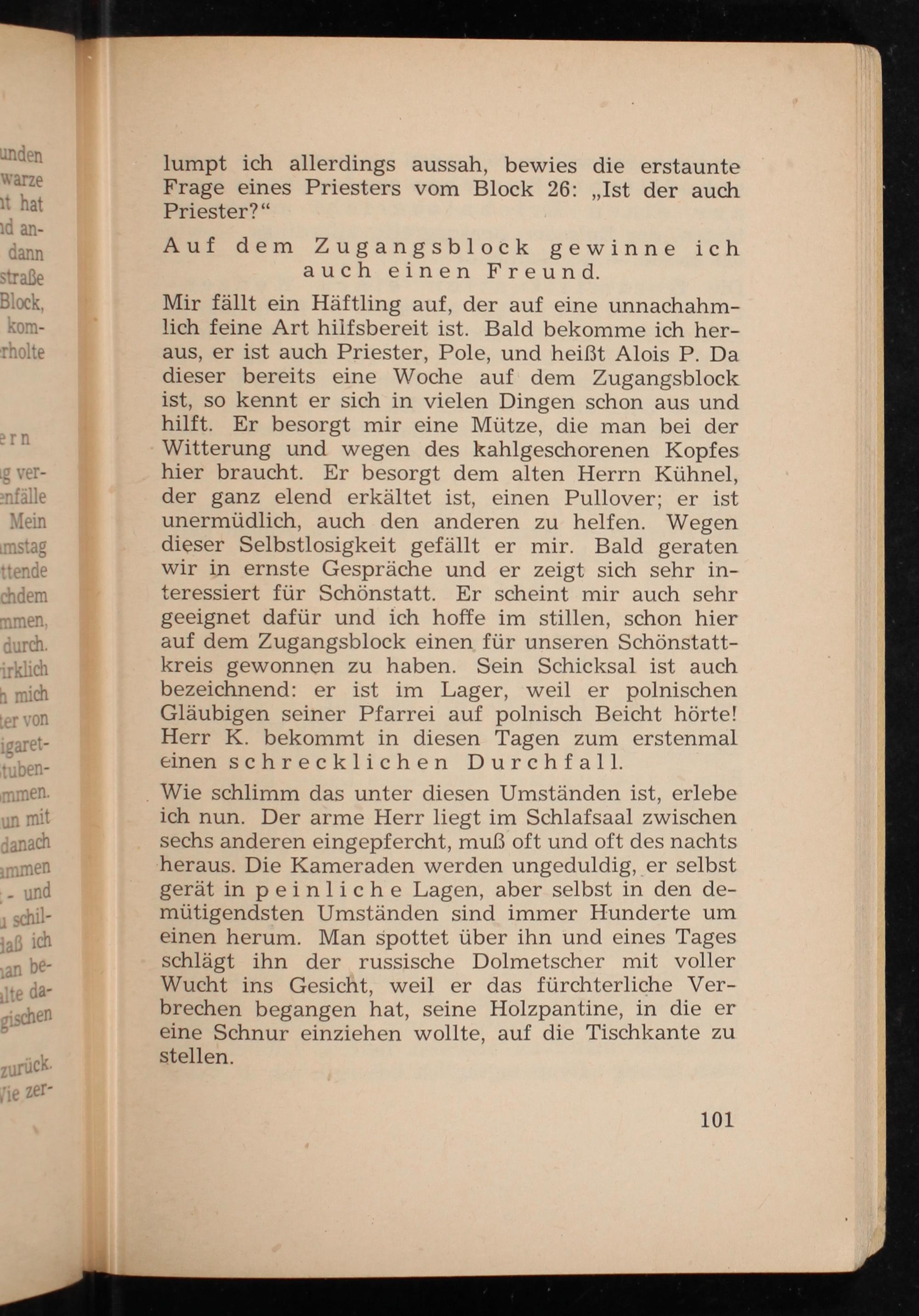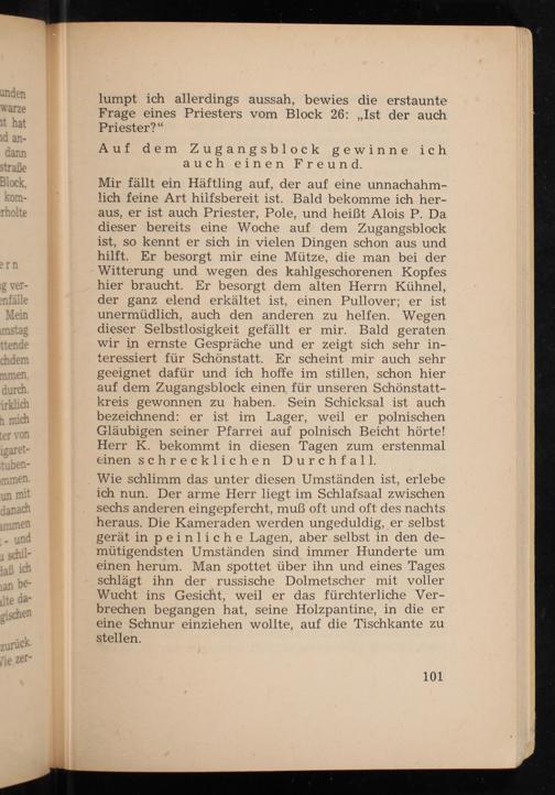 Mir fällt ein Häftling auf, der auf eine unnachahm- lich feine Art hilfsbereit ist. Bald bekomme ich her- aus, er ist auch Priester, Pole, und heißt Alois P. Da dieser bereits eine Woche auf dem Zugangsblock ist, so kennt er sich in vielen Dingen schon aus und hilft. Er besorgt mir eine Mütze, die man bei der Witterung und wegen des kahlgeschorenen Kopfes hier braucht. Er besorgt dem alten Herrn Kühnel, der ganz elend erkältet ist, einen Pullover; er ist unermüdlich, auch den anderen zu helfen. Wegen dieser Selbstlosigkeit gefällt er mir. Bald geraten wir in ernste Gespräche und er zeigt sich sehr in- teressiert für Schönstatt. Er scheint mir auch sehr geeignet dafür und ich hoffe im stillen, schon hier auf dem Zugangsblock einen für unseren Schönstatt-