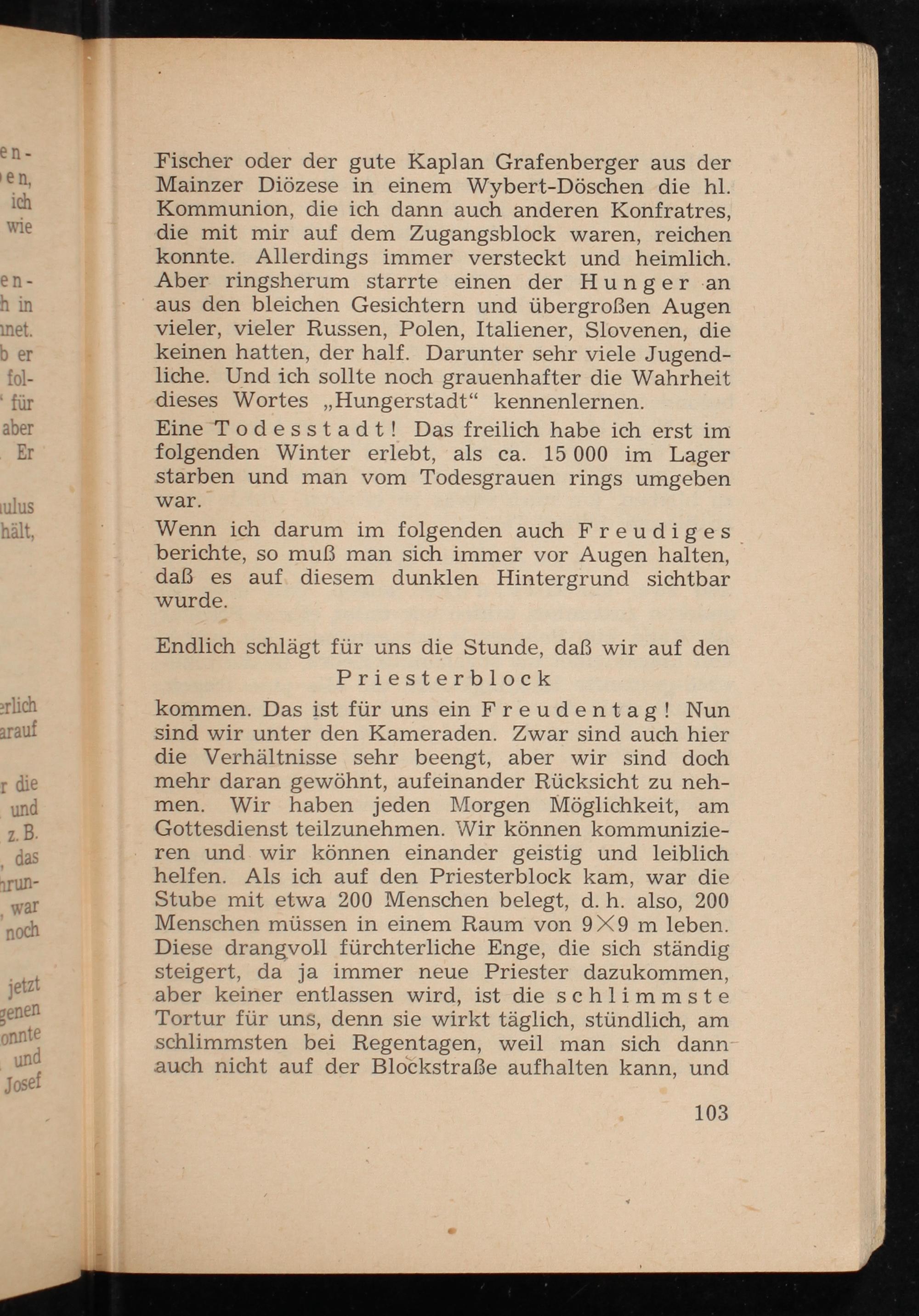 Fischer oder der gute Kaplan Grafenberger aus der Mainzer Diözese in einem Wybert-Döschen die hl. Kommunion, die ich dann auch anderen Konfratres, die mit mir auf dem Zugangsblock waren, reichen konnte. Allerdings immer versteckt und heimlich. Aber ringsherum starrte einen der Hunger an aus den bleichen Gesichtern und übergroßen Augen vieler, vieler Russen, Polen , Italiener, Slovenen, die keinen hatten, der half. Darunter sehr viele Jugend- liche. Und ich sollte noch grauenhafter die Wahrheit dieses Wortes„Hungerstadt“ kennenlernen.