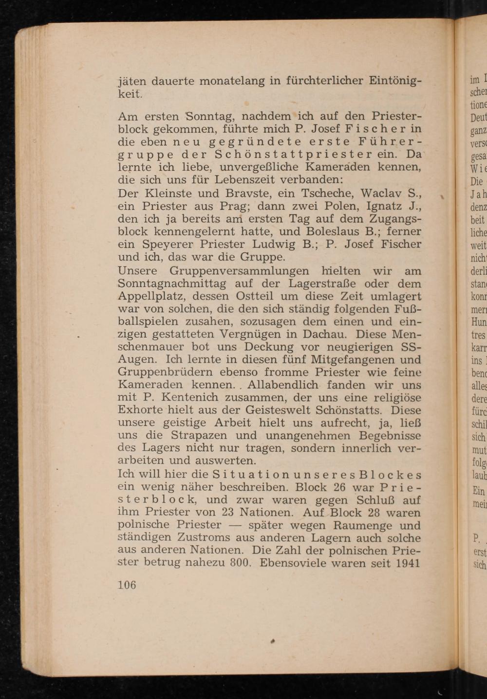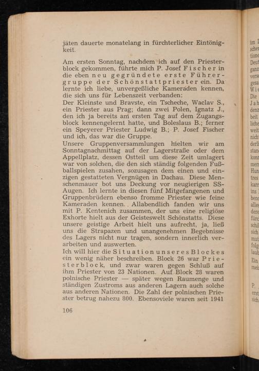 Unsere Gruppenversammlungen hielten wir am Sonntagnachmittag auf der Lagerstraße oder dem Appellplatz, dessen Ostteil um diese Zeit umlagert war von solchen, die den sich ständig folgenden Fußballspielen zusahen, sozusagen dem einen und einzigen gestatteten Vergnügen in Dachau . Diese Menschenmauer bot uns Deckung vor neugierigen SSAugen. Ich lernte in diesen fünf Mitgefangenen und Gruppenbrüdern ebenso fromme Priester wie feine Kameraden kennen.. Allabendlich fanden wir uns mit P. Kentenich zusammen, der uns eine religiöse Exhorte hielt aus der Geisteswelt Schönstatts. Diese unsere geistige Arbeit hielt uns aufrecht, ja, lieẞ uns die Strapazen und unangenehmen Begebnisse des Lagers nicht nur tragen, sondern innerlich verarbeiten und auswerten.