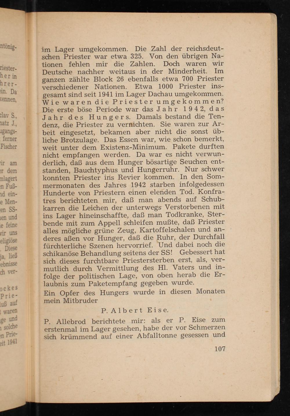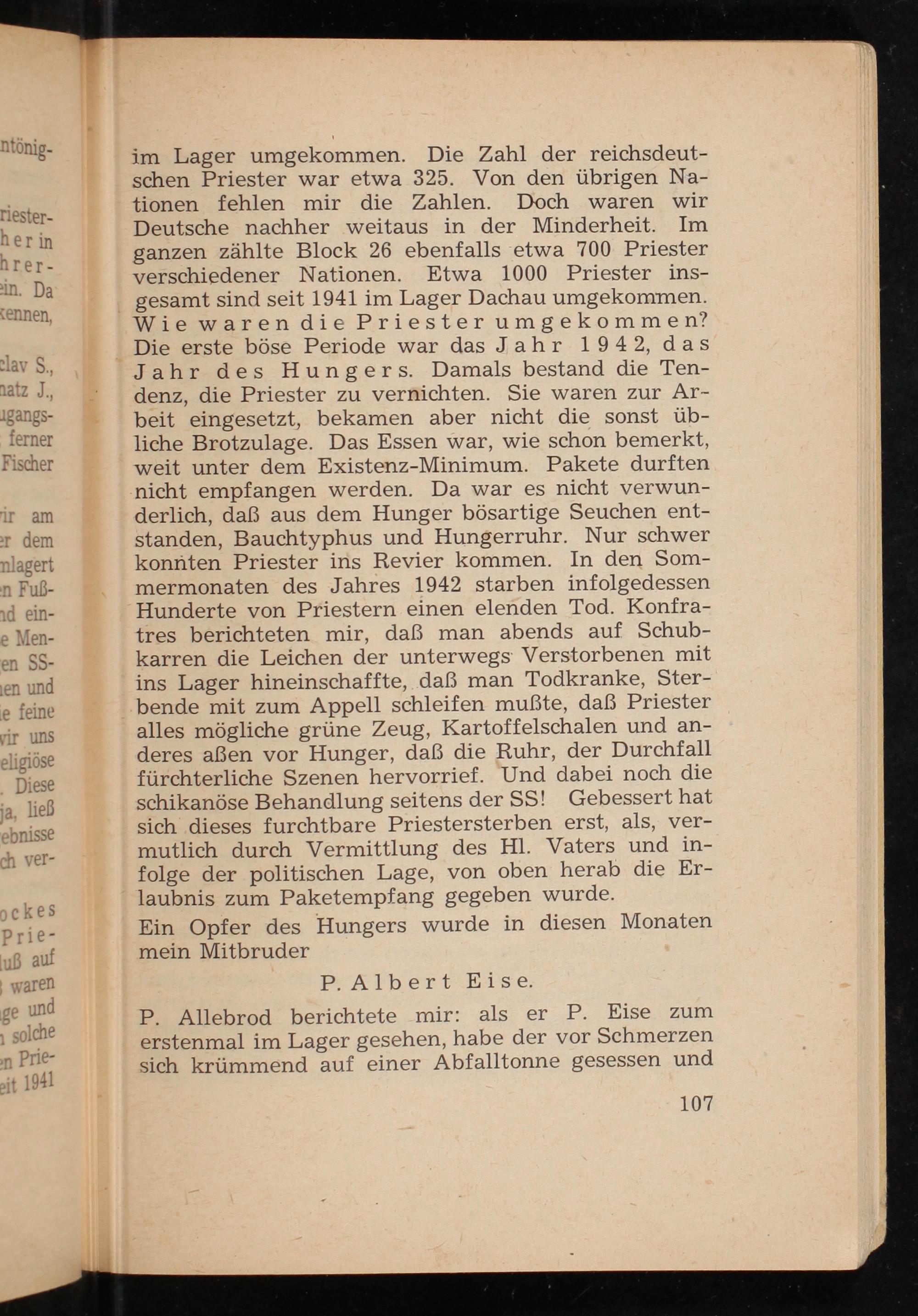 im Lager umgekommen. Die Zahl der reichsdeutschen Priester war etwa 325. Von den übrigen Nationen fehlen mir die Zahlen. Doch waren wir Deutsche nachher weitaus in der Minderheit. Im ganzen zählte Block 26 ebenfalls etwa 700 Priester verschiedener Nationen. Etwa 1000 Priester insgesamt sind seit 1941 im Lager Dachau umgekommen. Wie waren die Priester umgekommen? Die erste böse Periode war das Jahr 1942, das Jahr des Hungers. Damals bestand die Tendenz, die Priester zu vernichten. Sie waren zur Arbeit eingesetzt, bekamen aber nicht die sonst übliche Brotzulage. Das Essen war, wie schon bemerkt, weit unter dem Existenz- Minimum. Pakete durften nicht empfangen werden. Da war es nicht verwunderlich, daß aus dem Hunger bösartige Seuchen entstanden, Bauchtyphus und Hungerruhr. Nur schwer konnten Priester ins Revier kommen. In den Sommermonaten des Jahres 1942 starben infolgedessen Hunderte von Priestern einen elenden Tod. Konfratres berichteten mir, daß man abends auf Schubkarren die Leichen der unterwegs Verstorbenen mit ins Lager hineinschaffte, daß man Todkranke, Sterbende mit zum Appell schleifen mußte, daß Priester alles mögliche grüne Zeug, Kartoffelschalen und anderes aßen vor Hunger, daß die Ruhr, der Durchfall fürchterliche Szenen hervorrief. Und dabei noch die schikanöse Behandlung seitens der SS! Gebessert hat sich dieses furchtbare Priestersterben erst, als, vermutlich durch Vermittlung des Hl. Vaters und infolge der politischen Lage, von oben herab die Erlaubnis zum Paketempfang gegeben wurde.