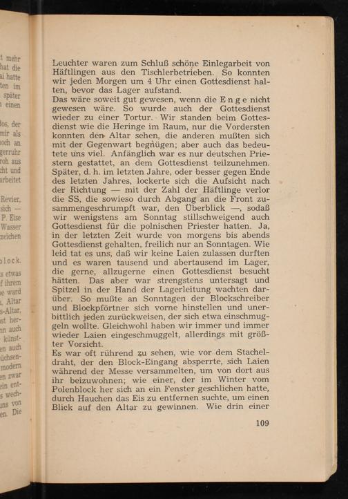 Es war oft rührend zu sehen, wie vor dem Stachel- draht, der den Block-Eingang absperrte, sich Laien während der Messe versammelten, um von dort aus ihr beizuwohnen; wie einer, der im Winter vom Polenblock her sich an ein Fenster geschlichen hatte, durch Hauchen das Eis zu entfernen suchte, um einen Blick auf den Altar zu gewinnen. Wie drin einer