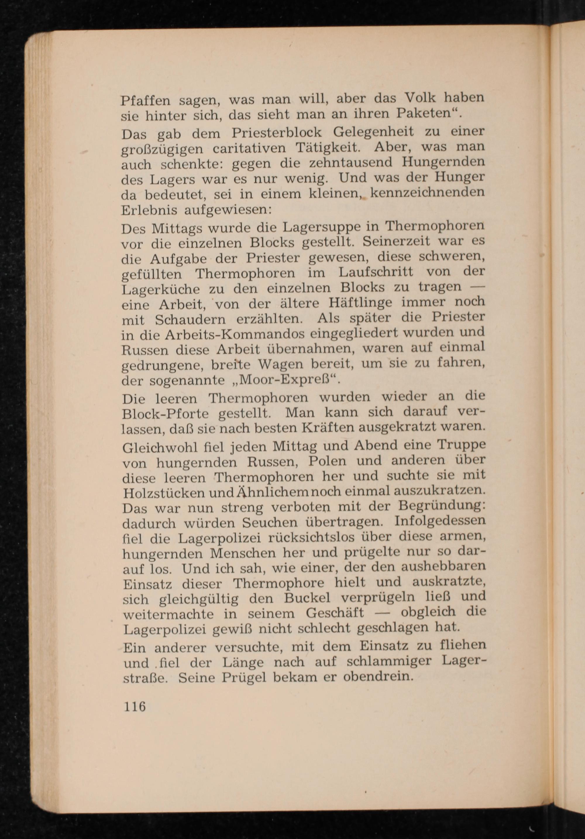 Des Mittags wurde die Lagersuppe in Thermophoren vor die einzelnen Blocks gestellt. Seinerzeit war es die Aufgabe der Priester gewesen, diese schweren, gefüllten Thermophoren im Laufschritt von der Lagerküche zu den einzelnen Blocks zu tragen- eine Arbeit, von der ältere Häftlinge immer noch mit Schaudern erzählten. Als später die Priester in die Arbeits- Kommandos eingegliedert wurden und Russen diese Arbeit übernahmen, waren auf einmal gedrungene, breite Wagen bereit, um sie zu fahren, der sogenannte„ Moor- Expreẞ".
