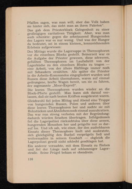 Pfaffen sagen, was man will, aber das Volk haben sie hinter sich, das sieht man an ihren Paketen". Das gab dem Priesterblock Gelegenheit zu einer großzügigen caritativen Tätigkeit. Aber, was man auch schenkte: gegen die zehntausend Hungernden des Lagers war es nur wenig. Und was der Hunger da bedeutet, sei in einem kleinen, kennzeichnenden Erlebnis aufgewiesen: