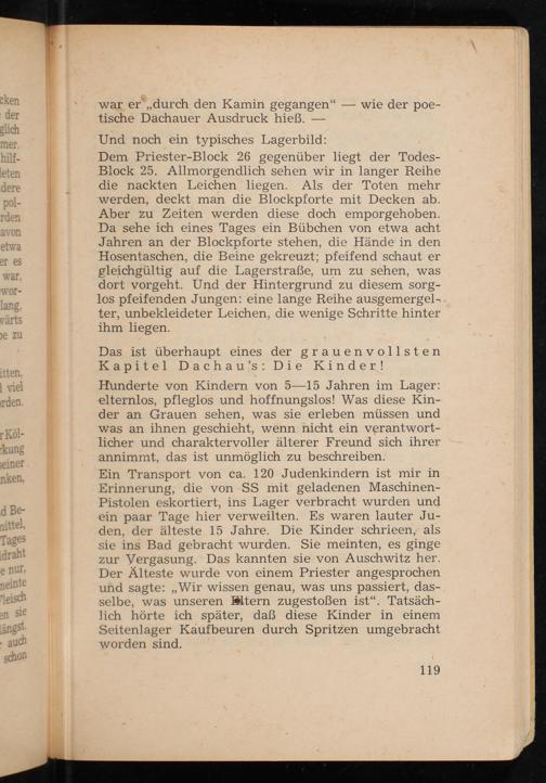 Ein Transport von ca. 120 Judenkindern ist mir in Erinnerung, die von SS mit geladenen Maschinen- Pistolen eskortiert, ins Lager verbracht wurden und ein paar Tage hier verweilten. Es waren lauter Ju- den, der älteste 15 Jahre. Die Kinder schrieen, als sie ins Bad gebracht wurden. Sie meinten, es ginge zur Vergasung. Das kannten sie von Auschwitz her. Der Älteste wurde von einem Priester angesprochen und sagte:„Wir wissen genau, was uns passiert, das- selbe, was unseren Bltern zugestoßen ist“. Tatsäch- lich hörte ich später, daß diese Kinder in einem Seitenlager Kaufbeuren durch Spritzen umgebracht worden sind.