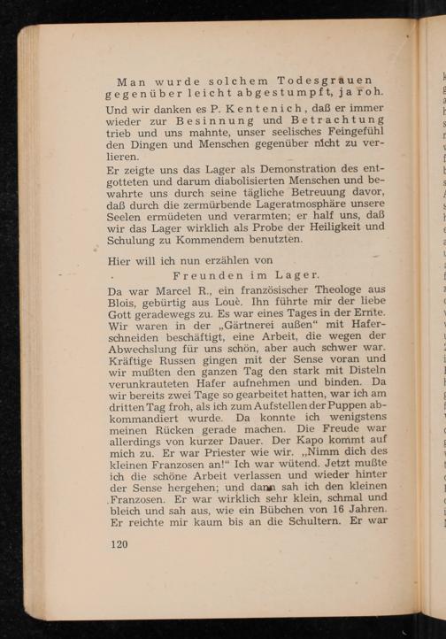 Da war Marcel R., ein französischer Theologe aus Blois , gebürtig aus Louè. Ihn führte mir der liebe Gott geradewegs zu. Es war eines Tages in der Ernte. Wir waren in der„ Gärtnerei außen" mit Haferschneiden beschäftigt, eine Arbeit, die wegen der Abwechslung für uns schön, aber auch schwer war. Kräftige Russen gingen mit der Sense voran und wir mußten den ganzen Tag den stark mit Disteln verunkrauteten Hafer aufnehmen und binden. Da wir bereits zwei Tage so gearbeitet hatten, war ich am dritten Tag froh, als ich zum Aufstellen der Puppen abkommandiert wurde. Da konnte ich wenigstens meinen Rücken gerade machen. Die Freude war allerdings von kurzer Dauer. Der Kapo kommt auf mich zu. Er war Priester wie wir. ,, Nimm dich des kleinen Franzosen an!" Ich war wütend. Jetzt muẞte ich die schöne Arbeit verlassen und wieder hinter der Sense hergehen; und dann sah ich den kleinen Franzosen. Er war wirklich sehr klein, schmal und bleich und sah aus, wie ein Bübchen von 16 Jahren. Er reichte mir kaum bis an die Schultern. Er war