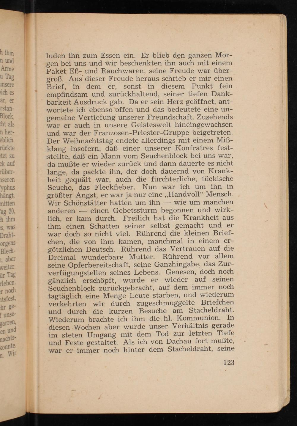 luden ihn zum Essen ein. Er blieb den ganzen Mor- gen bei uns und wir beschenkten ihn auch mit einem Paket. Eß- und Rauchwaren, seine Freude war über- groß. Aus dieser Freude heraus schrieb er mir einen Brief, in dem er, sonst.in diesem Punkt fein empfindsam und zurückhaltend, seiner tiefen Dank- barkeit Ausdruck gab. Da er sein Herz geöffnet, ant- wortete ich ebenso offen und das bedeutete eine un- gemeine Vertiefung unserer Freundschaft. Zusehends war er auch in unsere Geisteswelt hineingewachsen und war der Franzosen -Priester-Gruppe beigetreten. Der Weihnachtstag endete allerdings mit einem Miß- klang insofern, daß einer unserer Konfratres fest- stellte, daß ein Mann vom Seuchenblock bei uns war, da mußte er wieder zurück und dann dauerte es nicht lange, da packte ihn, der doch dauernd von Krank- heit gequält war, auch die fürchterliche, tückische Seuche, das Fleckfieber. Nun war ich um ihn in größter Angst, er war janur eine„Handvoll“ Mensch. Wir Schönstätter hatten um ihn— wie um manchen anderen— einen Gebetssturm begonnen und wirk- lich, er kam durch. Freilich hat die Krankheit aus ihm einen Schatten seiner selbst gemacht und er war doch so nicht viel. Rührend die kleinen Brief- chen, die von ihm kamen, manchmal in einem er- götzlichen Deutsch. Rührend das Vertrauen auf die Dreimal wunderbare Mutter. Rührend vor allem seine Opferbereitschaft, seine Ganzhingabe, das Zur- verfügungstellen seines Lebens. Genesen, doch noch gänzlich erschöpft, wurde er wieder auf seinen Seuchenblock zurückgebracht, auf dem immer noch tagtäglich eine Menge Leute starben, und wiederum verkehrten wir durch zugeschmuggelte Briefchen und durch die kurzen Besuche am Stacheldraht. Wiederum brachte ich ihm die hl. Kommunion. In