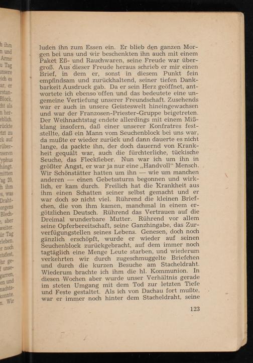 im steten Umgang mit dem Tod zur letzten Tiefe und Feste gestaltet. Als ich von Dachau fort mußte, war er immer noch hinter dem Stacheldraht, seine