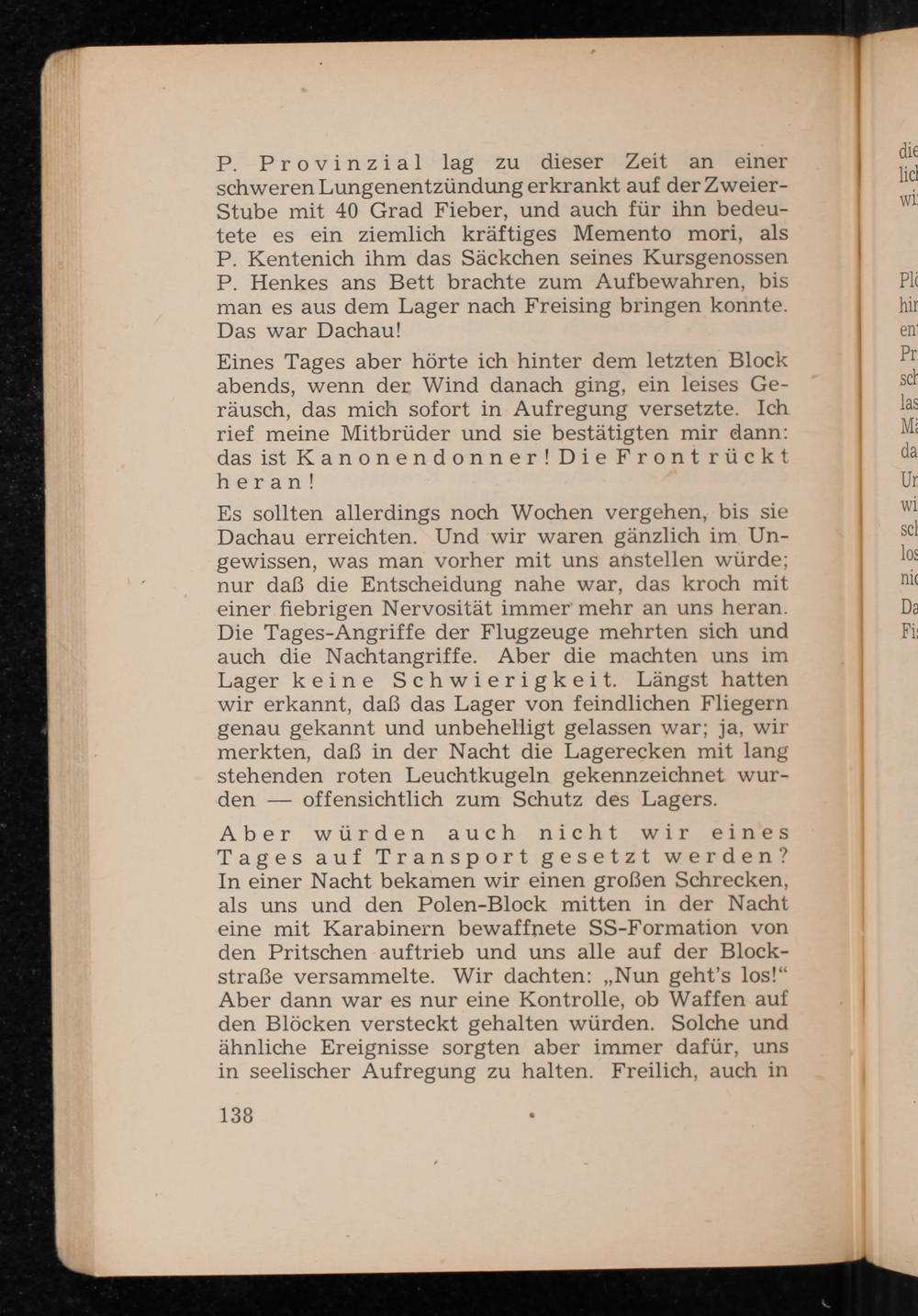 P. Provinzial lag zu dieser Zeit an einer schweren Lungenentzündung erkrankt auf der Zweier­Stube mit 40 Grad Fieber, und auch für ihn bedeu­tete es ein ziemlich kräftiges Memento mori , als P. Kentenich ihm das Säckchen seines Kursgenossen P. Henkes ans Bett brachte zum Aufbewahren, bis man es aus dem Lager nach Freising bringen konnte. Das war Dachau !