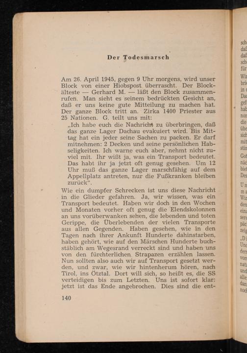 Am 26. April 1945, gegen 9 Uhr morgens, wird unser Block von einer Hiobspost überrascht. Der Blockälteste Gerhard M. läßt den Block zusammenrufen. Man sieht es seinem bedrückten Gesicht an, daß er uns keine gute Mitteilung zu machen hat. Der ganze Block tritt an. Zirka 1400 Priester aus 25 Nationen. G. teilt uns mit: