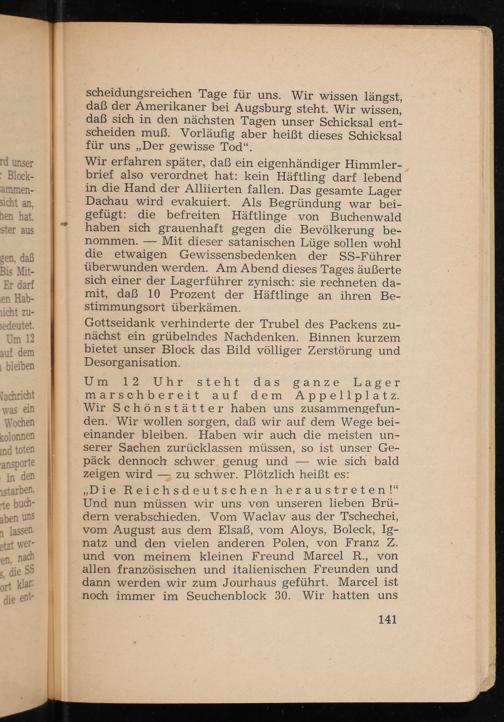 Wir erfahren später, daß ein eigenhändiger Himmler­brief also verordnet hat: kein Häftling darf lebend in die Hand der Alliierten fallen. Das gesamte Lager Dachau wird evakuiert. Als Begründung war bei­gefügt: die befreiten Häftlinge von Buchenwald haben sich grauenhaft gegen die Bevölkerung be­Mit dieser satanischen Lüge sollen wohl die etwaigen Gewissensbedenken der SS - Führer überwunden werden. Am Abend dieses Tages äußerte sich einer der Lagerführer zynisch: sie rechneten da­mit, daß 10 Prozent der Häftlinge an ihren Be­stimmungsort überkämen.