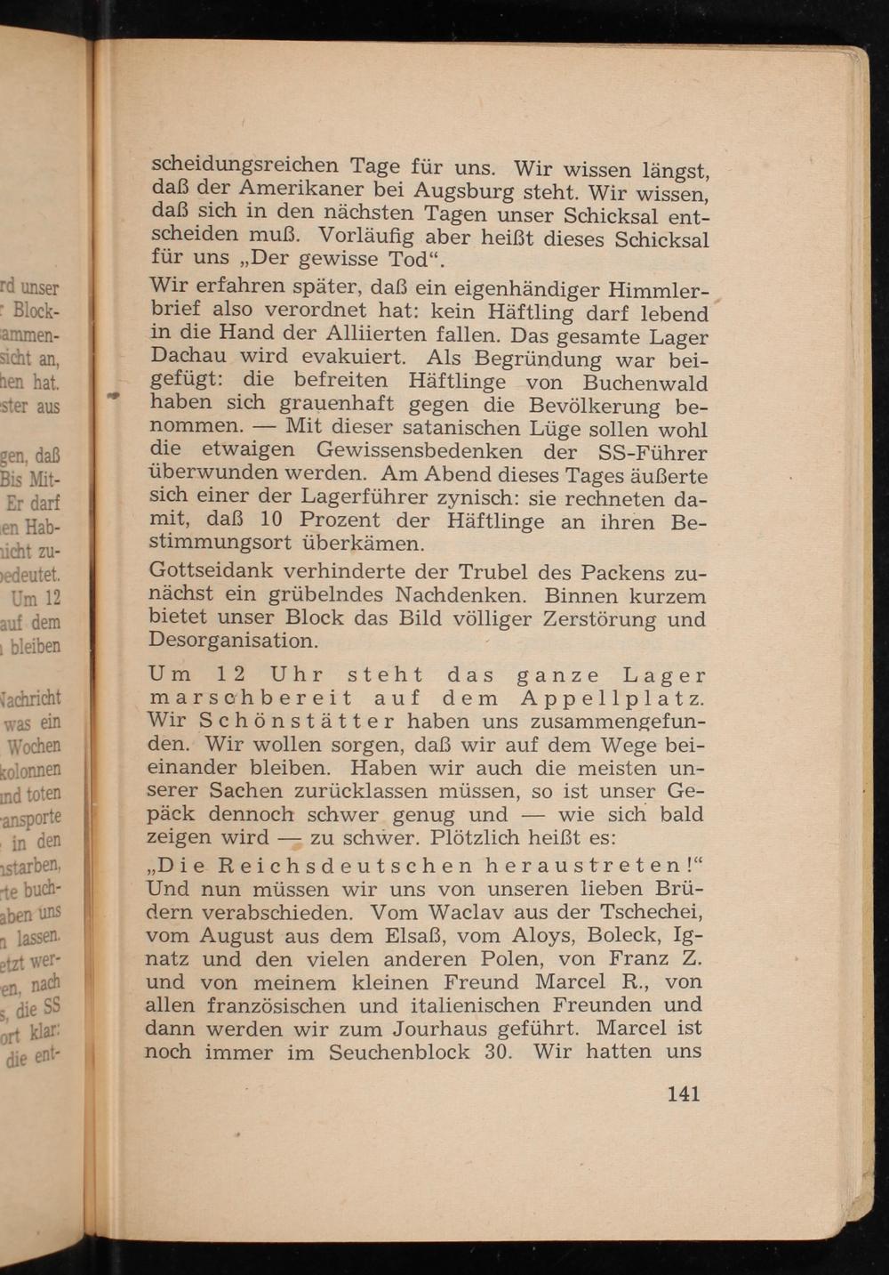 Wir erfahren später, daß ein eigenhändiger Himmlerbrief also verordnet hat: kein Häftling darf lebend in die Hand der Alliierten fallen. Das gesamte Lager Dachau wird evakuiert. Als Begründung war beigefügt: die befreiten Häftlinge von Buchenwald haben sich grauenhaft gegen die Bevölkerung beMit dieser satanischen Lüge sollen wohl die etwaigen Gewissensbedenken der SS - Führer überwunden werden. Am Abend dieses Tages äußerte sich einer der Lagerführer zynisch: sie rechneten damit, daß 10 Prozent der Häftlinge an ihren Bestimmungsort überkämen.