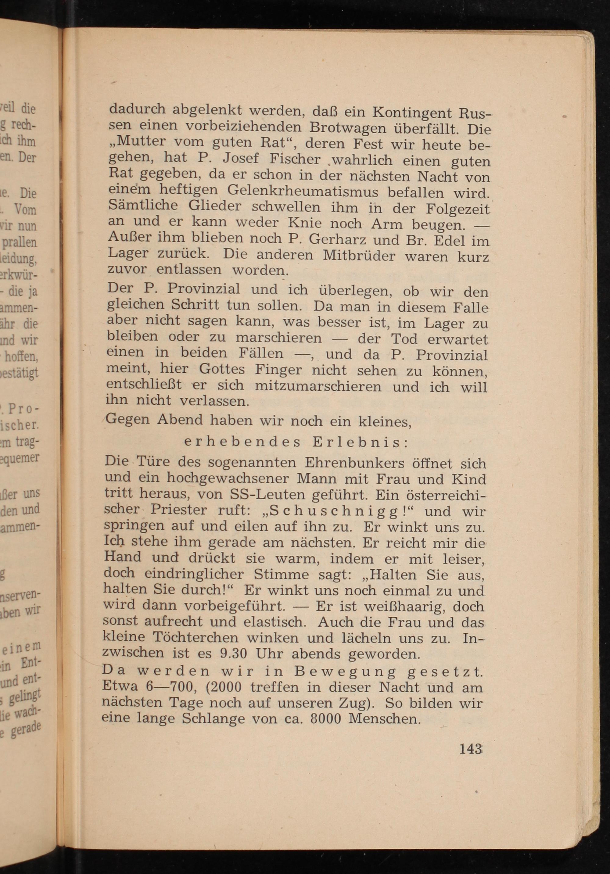 Der P. Provinzial und ich überlegen, ob wir den gleichen Schritt tun sollen. Da man in diesem Falle aber nicht sagen kann, was besser ist, im Lager zu bleiben oder zu marschieren— der Tod erwartet einen in beiden Fällen—, und da P. Provinzial meint, hier Gottes Finger nicht sehen zu können, entschließt er sich mitzumarschieren und ich will ihn nicht verlassen.