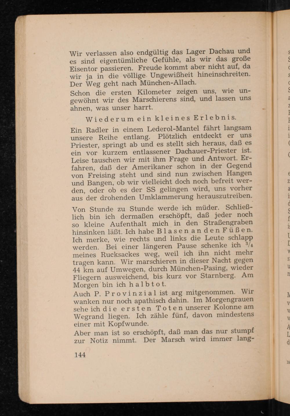 Ein Radler in einem Lederol- Mantel fährt langsam unsere Reihe entlang. Plötzlich entdeckt er uns Priester, springt ab und es stellt sich heraus, daß es ein vor kurzem entlassener Dachauer- Priester ist. Leise tauschen wir mit ihm Frage und Antwort. Erfahren, daß der Amerikaner schon in der Gegend von Freising steht und sind nun zwischen Hangen und Bangen, ob wir vielleicht doch noch befreit werden, oder ob es der SS gelingen wird, uns vorher aus der drohenden Umklammerung herauszutreiben. Von Stunde zu Stunde werde ich müder. Schließlich bin ich dermaßen erschöpft, daß jeder noch so kleine Aufenthalt mich in den Straßengraben hinsinken läßt. Ich habe Blasen an den Füßen. Ich merke, wie rechts und links die Leute schlapp werden. Bei einer längeren Pause schenke ich 3/4 meines Rucksackes weg, weil ich ihn nicht mehr tragen kann. Wir marschieren in dieser Nacht gegen 44 km auf Umwegen, durch München- Pasing, wieder Fliegern ausweichend, bis kurz vor Starnberg. Am Morgen bin ich halbtot.