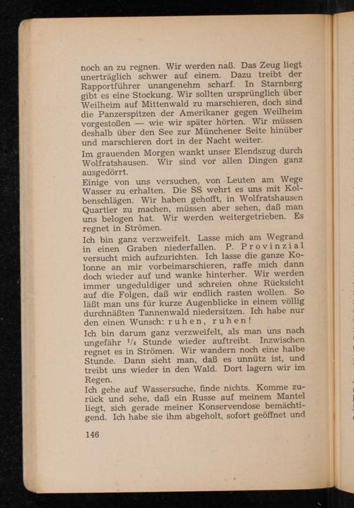 Ich bin ganz verzweifelt. Lasse mich am Wegrand in einen Graben niederfallen. P. Provinzial versucht mich aufzurichten. Ich lasse die ganze Kolonne an mir vorbeimarschieren, raffe mich dann doch wieder auf und wanke hinterher. Wir werden immer ungeduldiger und schreien ohne Rücksicht auf die Folgen, daß wir endlich rasten wollen. So läßt man uns für kurze Augenblicke in einem völlig durchnäßten Tannenwald niedersitzen. Ich habe nur den einen Wunsch: ruhen, ruhen!