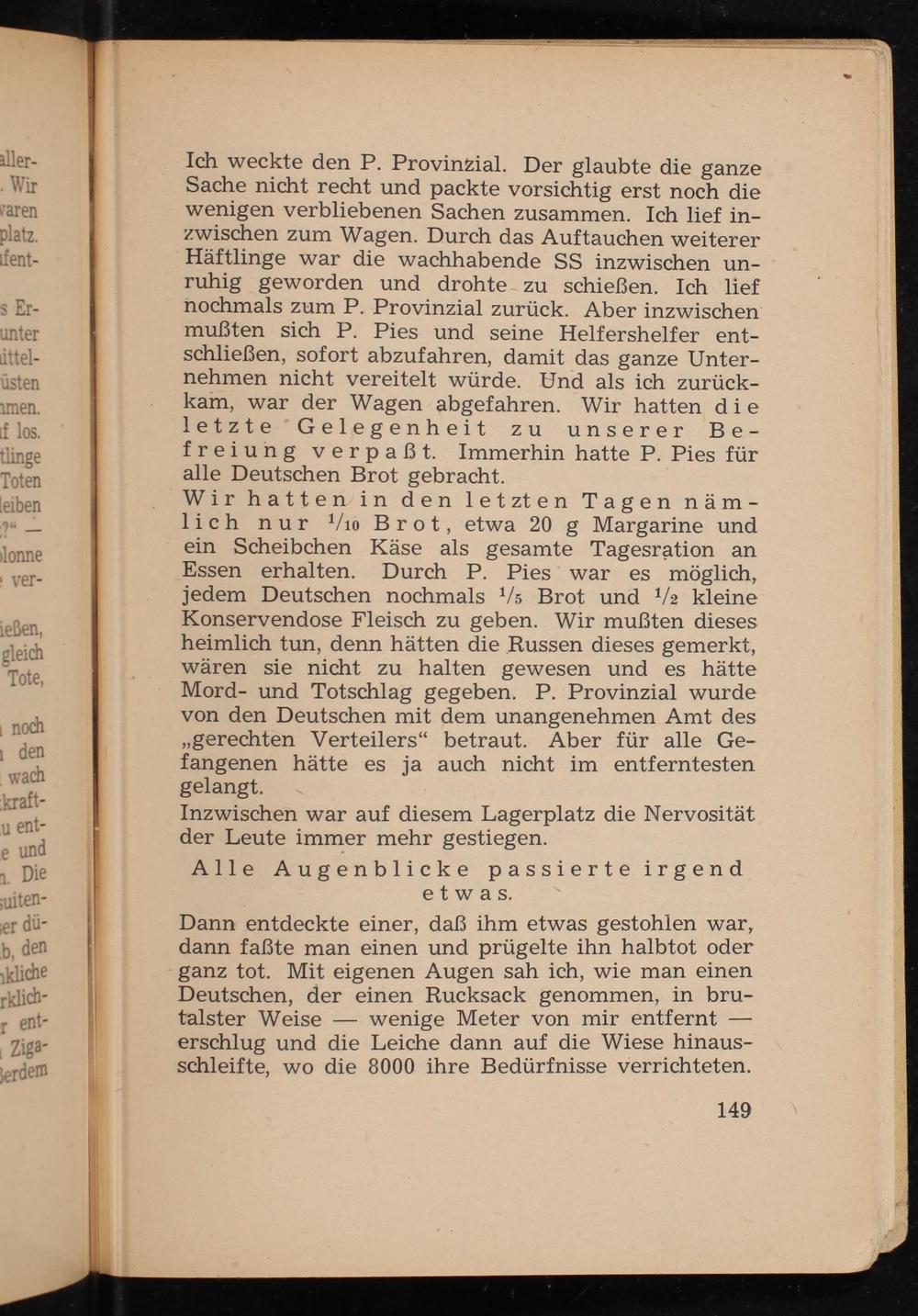 Ich weckte den P. Provinzial. Der glaubte die ganze Sache nicht recht und packte vorsichtig erst noch die wenigen verbliebenen Sachen zusammen. Ich lief in- zwischen zum Wagen. Durch das Auftauchen weiterer Häftlinge war die wachhabende SS inzwischen un- ruhig geworden und drohte_zu schießen. Ich lief nochmals zum P. Provinzial zurück. Aber inzwischen mußten sich P. Pies und seine Helfershelfer ent- schließen, sofort abzufahren, damit das ganze Unter- nehmen nicht vereitelt würde. Und als ich zurück- kam, war der Wagen abgefahren. Wir hatten die letzte’Gelegenheit zu unserer Be- freiung verpaßt. Immerhin hatte P. Pies für alle Deutschen Brot gebracht.