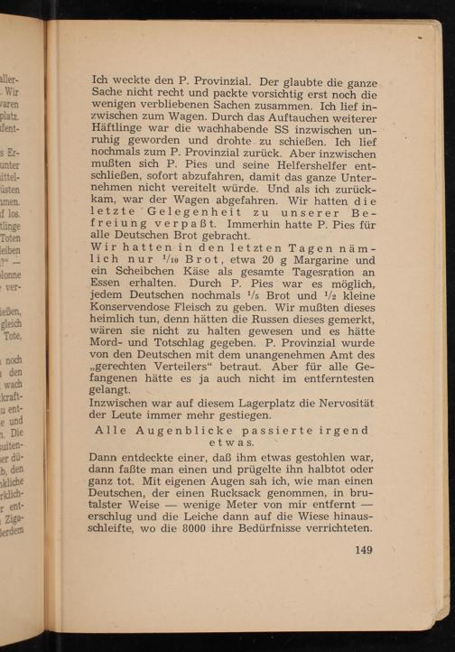 Bere hattenmin den letzten Tagen näm- lich nur!ı Brot, etwa 20 g Margarine und ein Scheibchen Käse als gesamte Tagesration an Essen erhalten. Durch P. Pies war es möglich, jedem Deutschen nochmals 1/;s Brot und!/2 kleine Konservendose Fleisch zu geben. Wir mußten dieses heimlich tun, denn hätten die Russen dieses gemerkt, wären sie nicht zu halten gewesen und es hätte Mord- und Totschlag gegeben. P. Provinzial wurde von den Deutschen mit dem unangenehmen Amt des „gerechten Verteilers“ betraut. Aber für alle Ge- fangenen hätte es ja auch nicht im entferntesten gelangt.