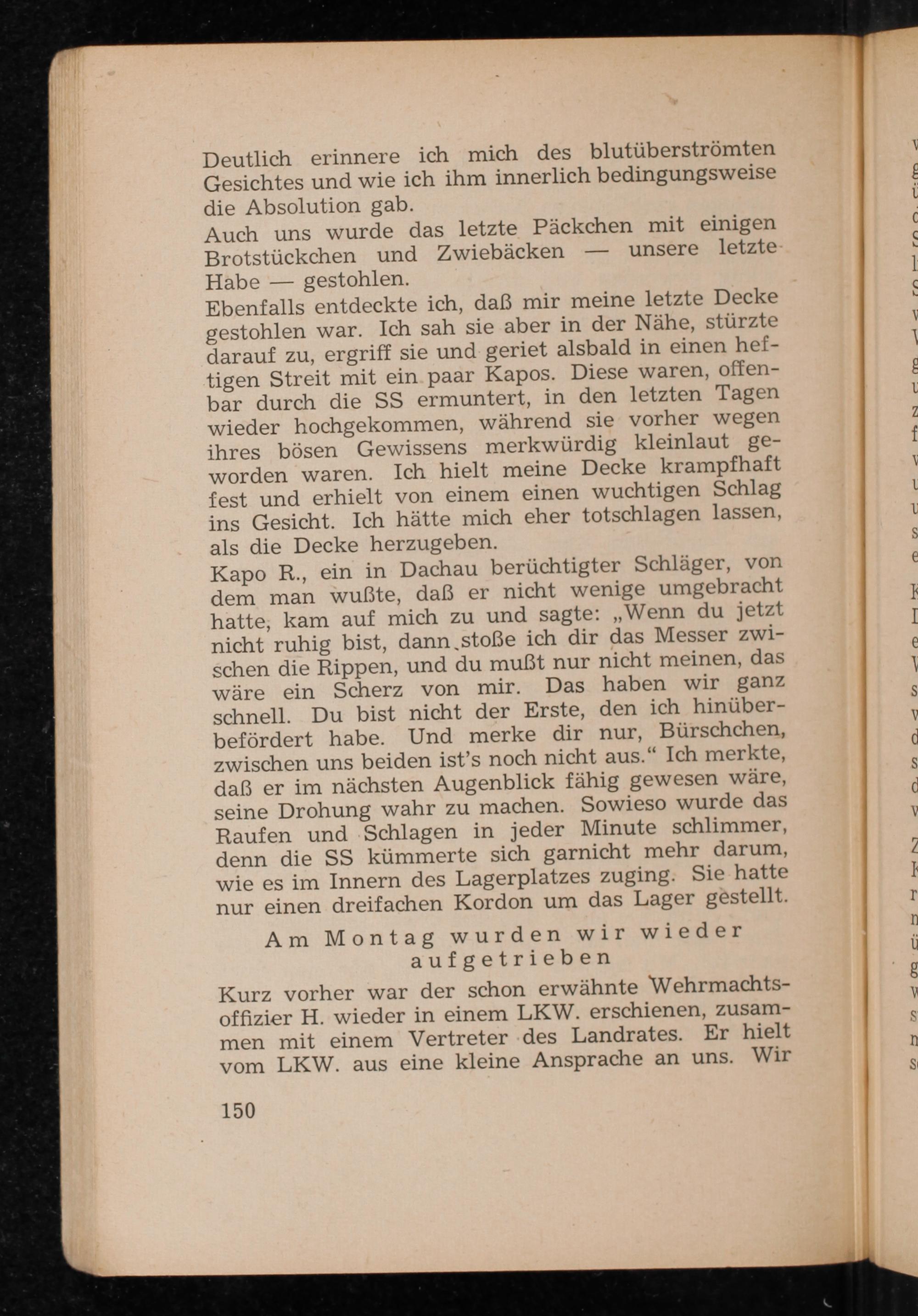Kapo R., ein in Dachau berüchtigter Schläger, von dem man wußte, daß er nicht wenige umgebracht hatte, kam auf mich zu und sagte:„ Wenn du jetzt nicht ruhig bist, dann stoße ich dir das Messer zwischen die Rippen, und du mußt nur nicht meinen, das wäre ein Scherz von mir. Das haben wir ganz schnell. Du bist nicht der Erste, den ich hinüberbefördert habe. Und merke dir nur, Bürschchen, zwischen uns beiden ist's noch nicht aus." Ich merkte, daß er im nächsten Augenblick fähig gewesen wäre, seine Drohung wahr zu machen. Sowieso wurde das Raufen und Schlagen in jeder Minute schlimmer, denn die SS kümmerte sich garnicht mehr darum, wie es im Innern des Lagerplatzes zuging. Sie hatte nur einen dreifachen Kordon um das Lager gestellt.