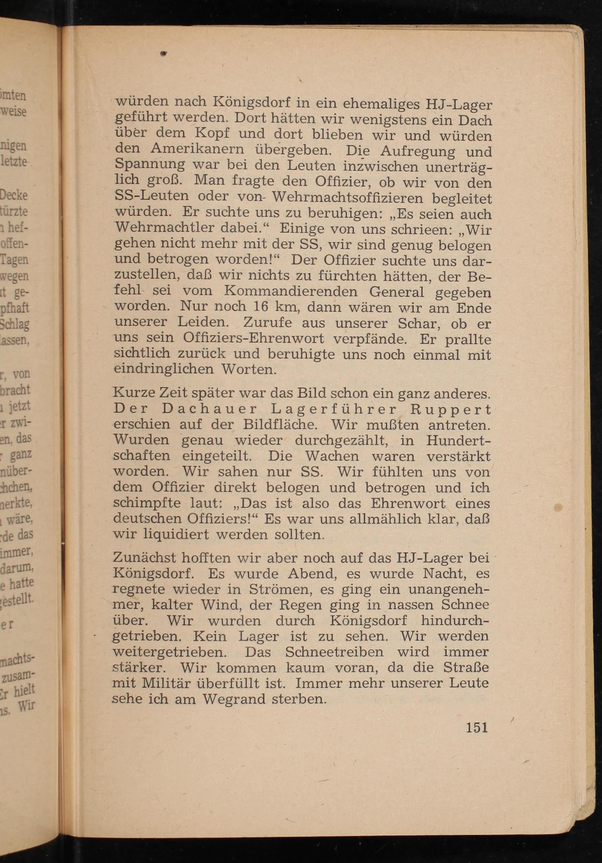 würden nach Königsdorf in ein ehemaliges HJ-Lager geführt werden. Dort hätten wir wenigstens ein Dach über dem Kopf und dort blieben wir und würden den Amerikanern übergeben. Die Aufregung und Spannung war bei den Leuten inzwischen unerträg- lich groß. Man fragte den Offizier, ob wir von den SS -Leuten oder von- Wehrmachtsoffizieren begleitet würden. Er suchte uns zu beruhigen:„Es seien auch Wehrmachtler dabei.“ Einige von uns schrieen:„Wir gehen nicht mehr mit der SS, wir sind genug belogen und betrogen worden!“ Der Offizier suchte uns dar- zustellen, daß wir nichts zu fürchten hätten, der Be- fehl sei vom Kommandierenden General gegeben worden. Nur noch 16 km, dann wären wir am Ende unserer Leiden. Zurufe aus unserer Schar, ob er uns sein Offiziers-Ehrenwort verpfände. Er prallte sichtlich zurück und beruhigte uns noch einmal mit eindringlichen Worten.