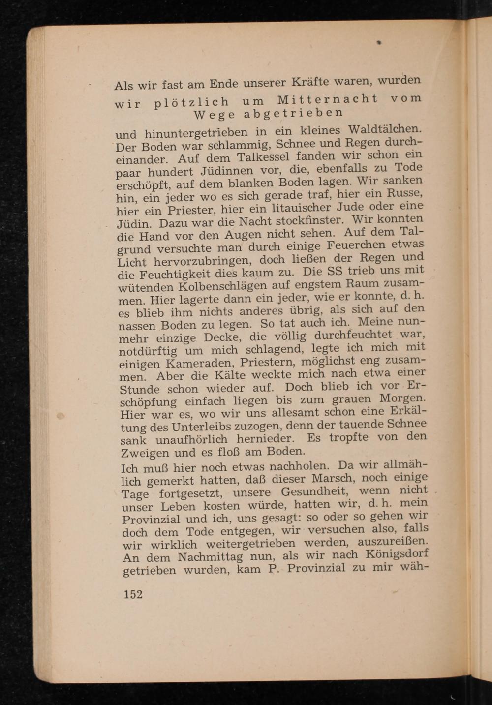 und hinuntergetrieben in ein kleines Waldtälchen. Der Boden war schlammig, Schnee und Regen durcheinander. Auf dem Talkessel fanden wir schon ein paar hundert Jüdinnen vor, die, ebenfalls zu Tode erschöpft, auf dem blanken Boden lagen. Wir sanken hin, ein jeder wo es sich gerade traf, hier ein Russe, hier ein Priester, hier ein litauischer Jude oder eine Jüdin. Dazu war die Nacht stockfinster. Wir konnten die Hand vor den Augen nicht sehen. Auf dem Talgrund versuchte man durch einige Feuerchen etwas Licht hervorzubringen, doch ließen der Regen und die Feuchtigkeit dies kaum zu. Die SS trieb uns mit wütenden Kolbenschlägen auf engstem Raum zusammen. Hier lagerte dann ein jeder, wie er konnte, d. h. es blieb ihm nichts anderes übrig, als sich auf den nassen Boden zu legen. So tat auch ich. Meine nunmehr einzige Decke, die völlig durchfeuchtet war, notdürftig um mich schlagend, legte ich mich mit einigen Kameraden, Priestern, möglichst eng zusammen. Aber die Kälte weckte mich nach etwa einer Stunde schon wieder auf. Doch blieb ich vor Erschöpfung einfach liegen bis zum grauen Morgen. Hier war es, wo wir uns allesamt schon eine Erkältung des Unterleibs zuzogen, denn der tauende Schnee sank unaufhörlich hernieder. Es tropfte von den Zweigen und es floẞ am Boden.