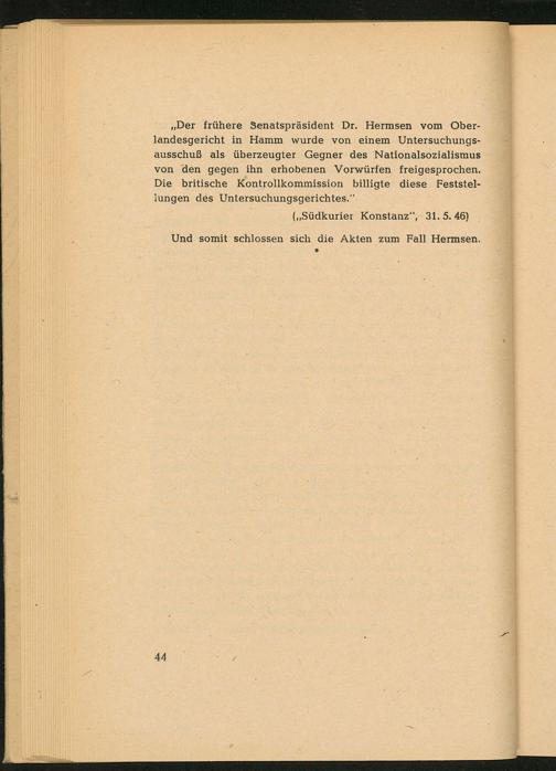 „Der frühere Senatspräsident Dr. Hermsen vom Ober- landesgericht in Hamm wurde von einem Untersuchungs- ausschuß als überzeugter Gegner des Nationalsozialismus von den gegen ihn erhobenen Vorwürfen freigesprochen. Die britische Kontrollkommission billigte diese Feststel- iungen des Untersuchungsgerichtes.‘