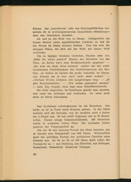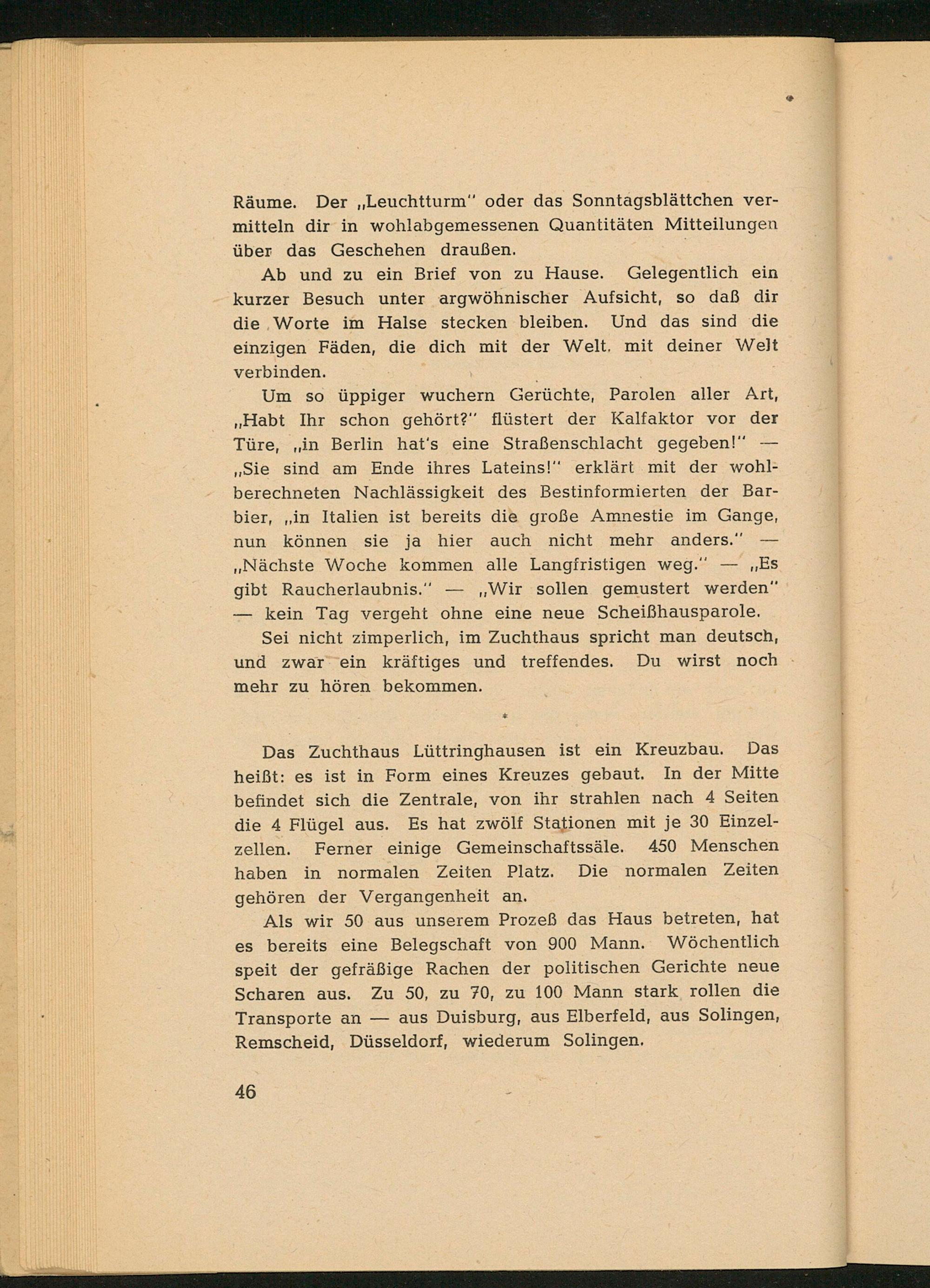 Das Zuchthaus Lüttringhausen ist ein Kreuzbau. Das heißt: es ist in Form eines Kreuzes gebaut. In der Mitte befindet sich die Zentrale, von ihr strahlen nach 4 Seiten die 4 Flügel aus. Es hat zwölf Stationen mit je 30 Einzel- zellen. Ferner einige Gemeinschaftssäle. 450 Menschen haben in normalen Zeiten Platz. Die normalen Zeiten gehören der Vergangenheit an.