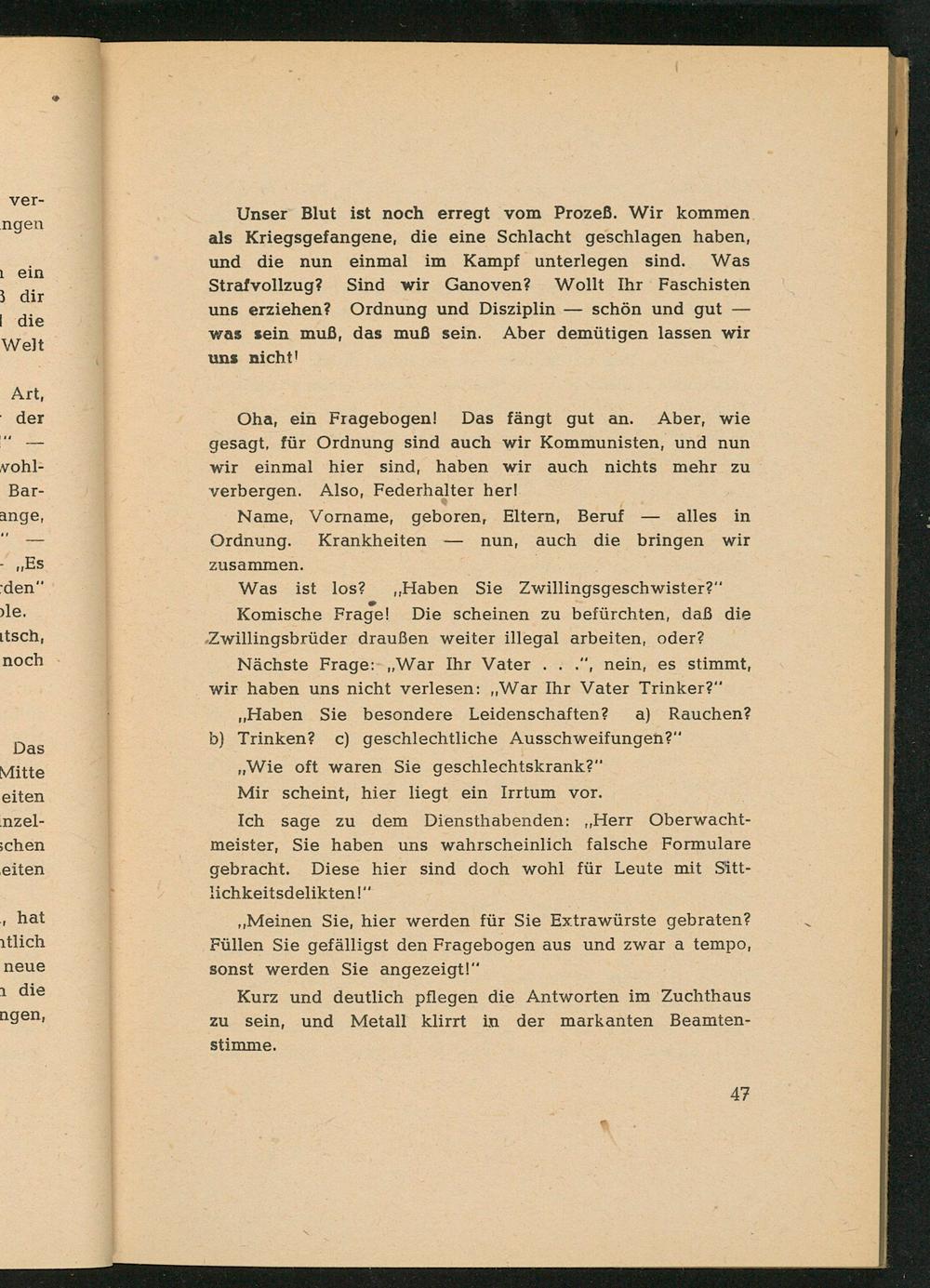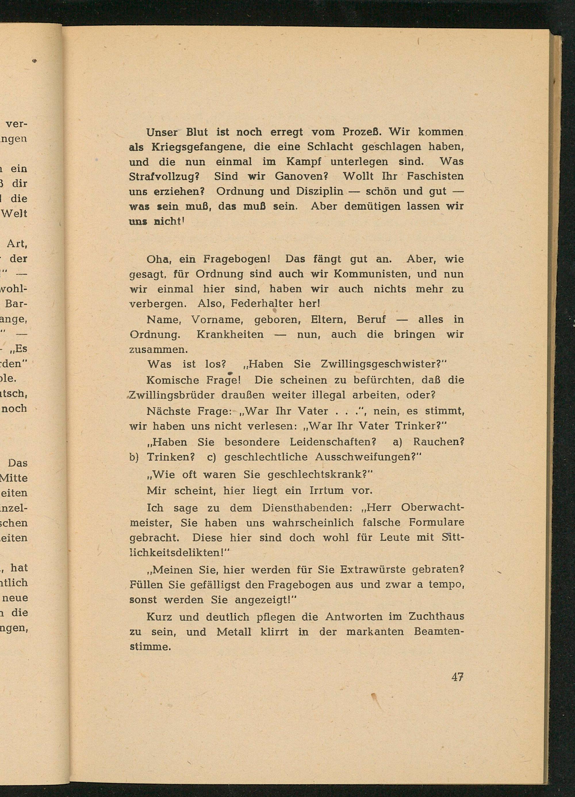Nächste Frage: War Ihr Vater...", nein, es stimmt, wir haben uns nicht verlesen: ,, War Ihr Vater Trinker?" ,, Haben Sie besondere Leidenschaften? a) Rauchen? b) Trinken? c) geschlechtliche Ausschweifungen?" ,, Wie oft waren Sie geschlechtskrank?" Mir scheint, hier liegt ein Irrtum vor.